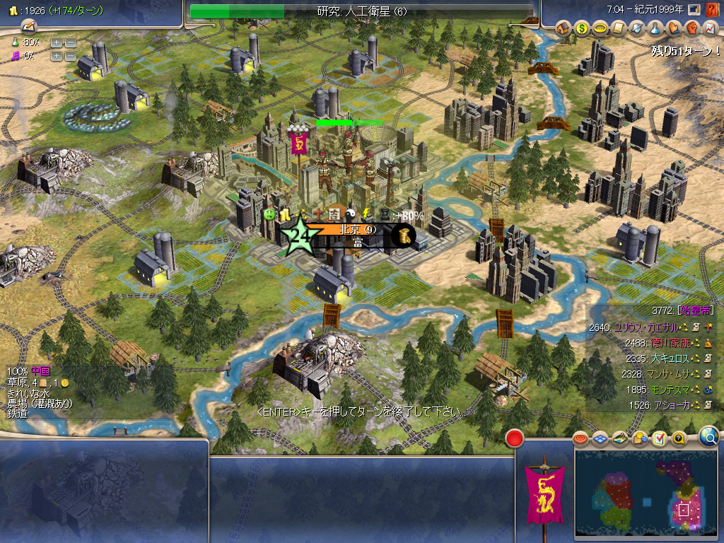 だからといってこのゲームで,ちまちまと中間的な性質の都市ばかり揃えるのはよろしくない。逆に,「この都市ではお金を稼ぐ」「この都市では偉人を生産」といった感じで,メリハリをつけたほうが有利になる。すべての都市をそのように特化させるのはたいへんだが,自文明のなかでも上位の都市には,はっきりした性格付けをしたほうがよい。なぜならそのほうが,文化遺産,とりわけ国家遺産の能力を生かしやすいからだ。