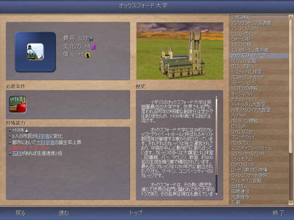 とはいえ,いつかは特化の道を選ぶことになる。選択の期限としては,オックスフォード大学(科学者を中心とした専門家生産/ビーカー量を稼ぐ都市として使う場合)やウォール街(コイン型都市として使う場合)を作るくらいまでになるだろう。