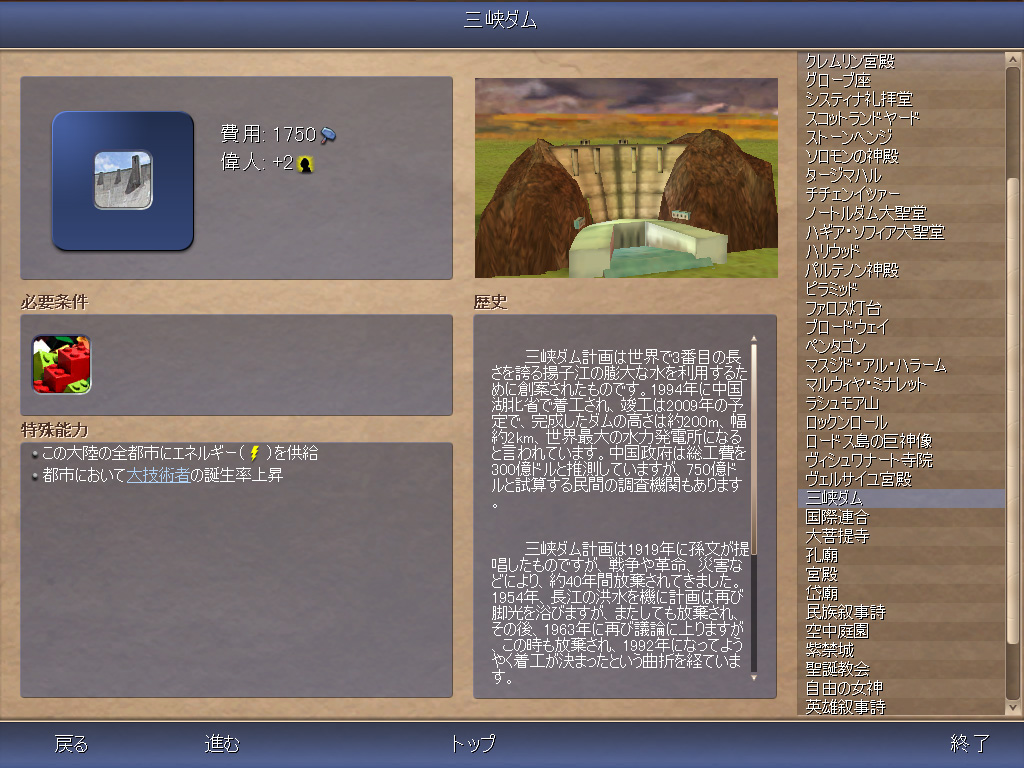 同じ大陸のすべての自文明都市に電力を供給できる「三峡ダム」。非常に強力な世界遺産だが,川沿いの都市にしか建設できない