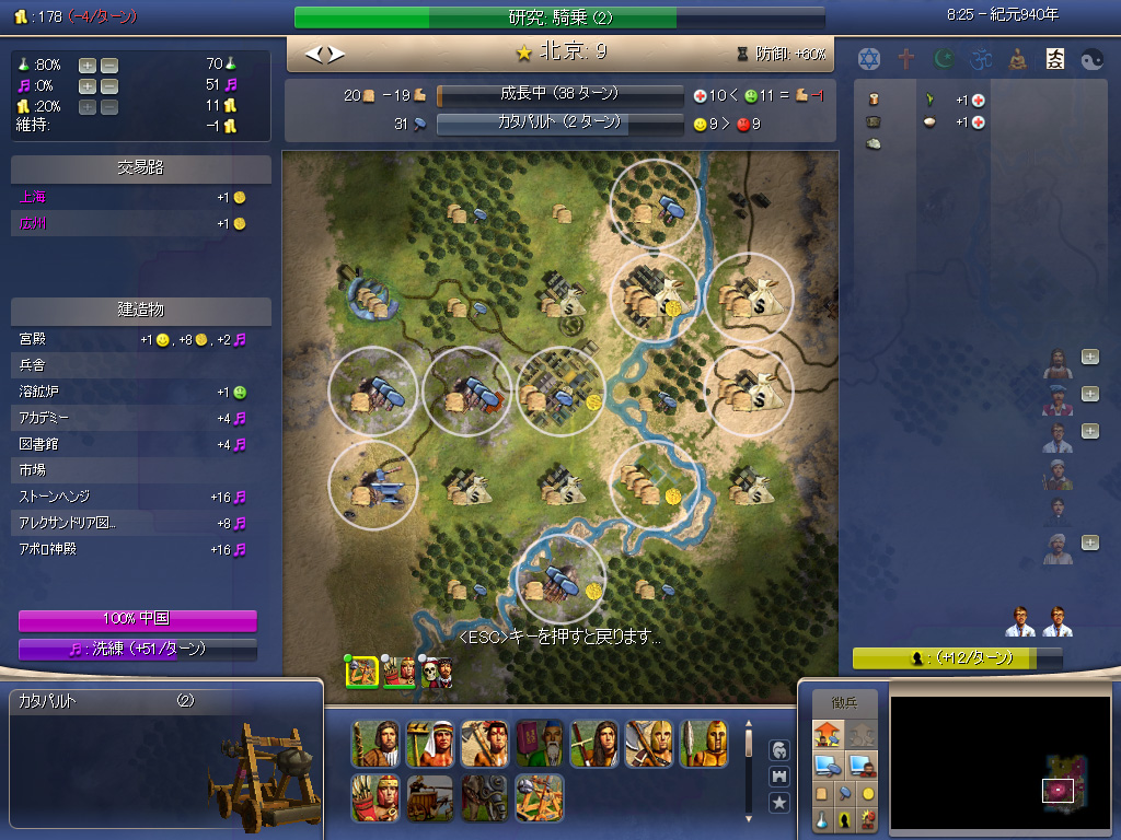 都市の人口が十数人程度までなら,市民を配置し直してやるだけで,収益構造が大きく変わることがある。同一の都市で,ハンマー収入を重視して,市民を配置し直したのが右の画面だ。その時々の目的に合った配置に変えることは,見落としがちだが重要なテクニックである |