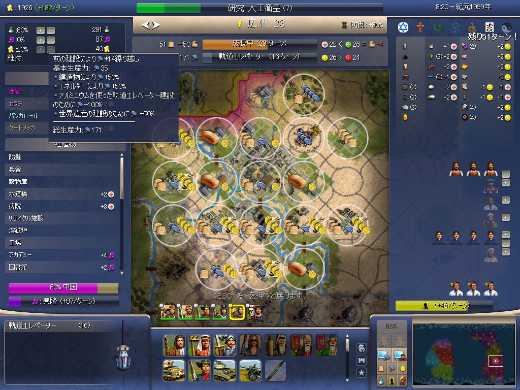 このプレイでは,緯度の関係で前述の科学者都市で軌道エレベータを作らなければならなくなった。だが,科学者をすべて技術者(ハンマー+2)と聖職者(同+1)に転換すると,志向ボーナスや資源ボーナスの恩恵もあって,十分に高いハンマー生産量が実現できた