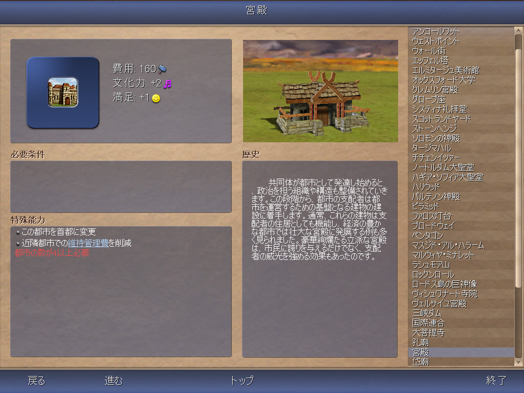 「宮殿」には本文で述べたような特別ルールが適用される。それを知らずに,あちこちに作ってしまった……というのはよく聞く失敗の例。首都の移転はただでさえリスキーなので,慎重に行いたいものだ