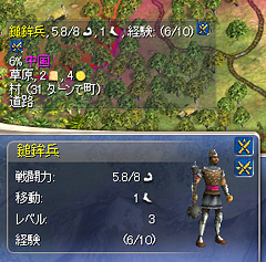 ユニットが選択された状態では,ステータスが画面左下に表示される。画面は傷ついたユニットなので,「戦闘力」が小数として表示されている