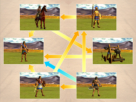 という2条件を満たすものと考えてよい。どちらを考えるうえでも,前述のようなシステムやユニットの能力について,よく知っておくことが重要だ。とくに,使われることが多いユニットの強弱関係や戦闘ボーナスは熟知しておきたい。苦手にしている文明があるときは,その文明の固有ユニットについても調べておくと,打開策が得られることがある。