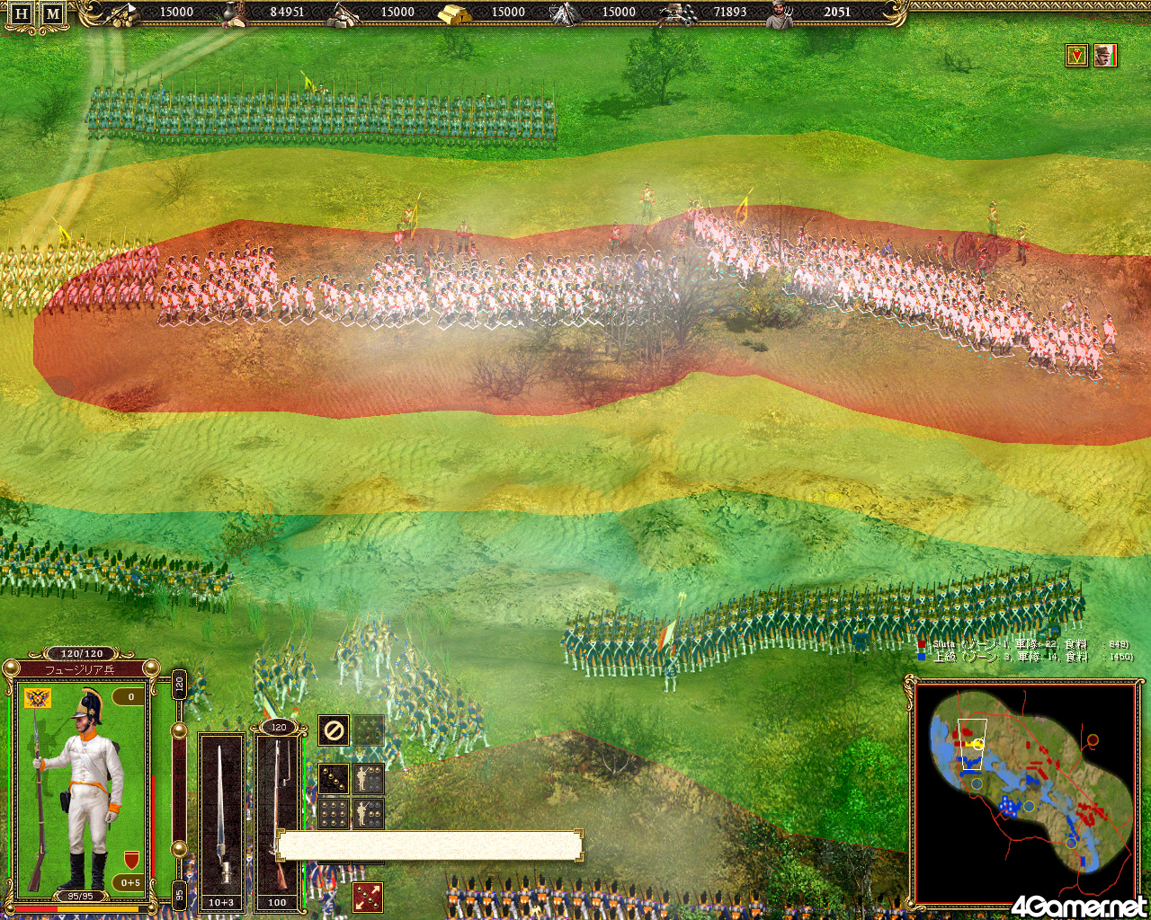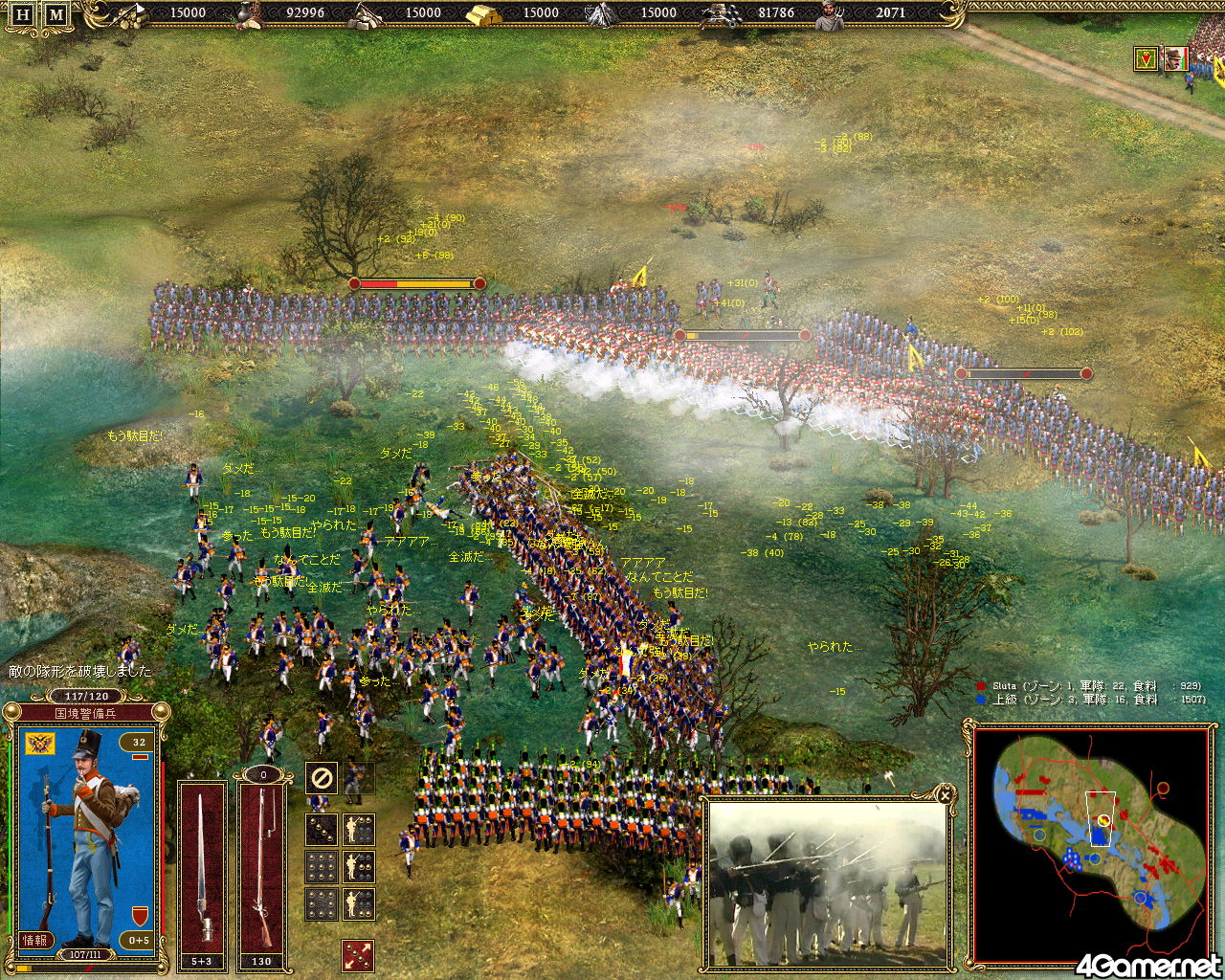 騎兵を側面に配置しながら,少しずつ前進する。士気が50以下の部隊であれば,一斉射撃を浴びせることによって,画面で緑色のゾーンへの射撃でも,隊形を崩壊させられるはず。潰走した敵兵士は周辺の部隊の士気を下げるので,その連鎖でどんどん全体の士気を下げることが可能だ。