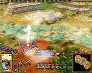 さて問題のA地点。まずは中央の方陣隊形の国民軍部隊を,こちらの大砲3門で集中砲撃する。多少時間はかかるが,それだけでこの国民軍部隊は潰走するはずである。これで攻撃の突破口が開けるので,続いてフュージリア兵部隊を二つ並べて前へ出し,一斉射撃できる態勢にする。