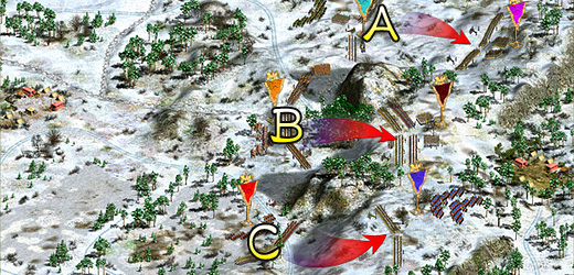 こういう場合,それぞれの地点で別々に戦って,全面撃破を目指すという方法での勝利も不可能ではないのだが,より効率的に,つまり少ない損害で勝利するためには,どこか楽な地点をまず突破し,そこを足がかりにして残りの2地点を攻略するという作戦でいきたい。