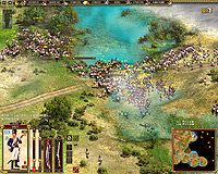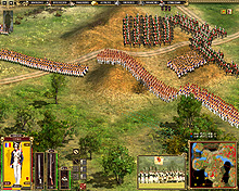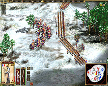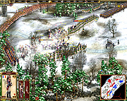 A地点とB地点は方陣で防御しつつ,C地点に徹底して主力部隊を送り続ける。内政の基盤が固まったら,てき弾兵と竜騎兵の生産を開始したいところ。左右から回り込んで包囲し,C地点の中心にある金産出居留地を占領する。