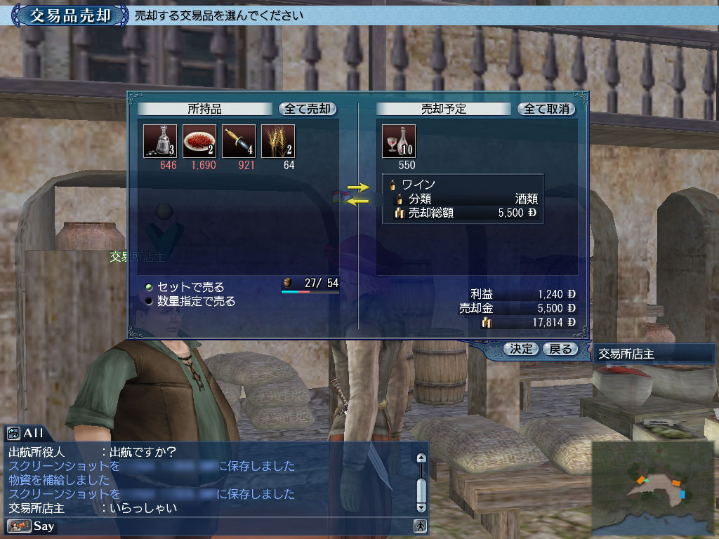 高価な交易品をテキトーに仕入れてはみたものの,どの町の交易所をのぞいても需要のないものばかりだった…… |