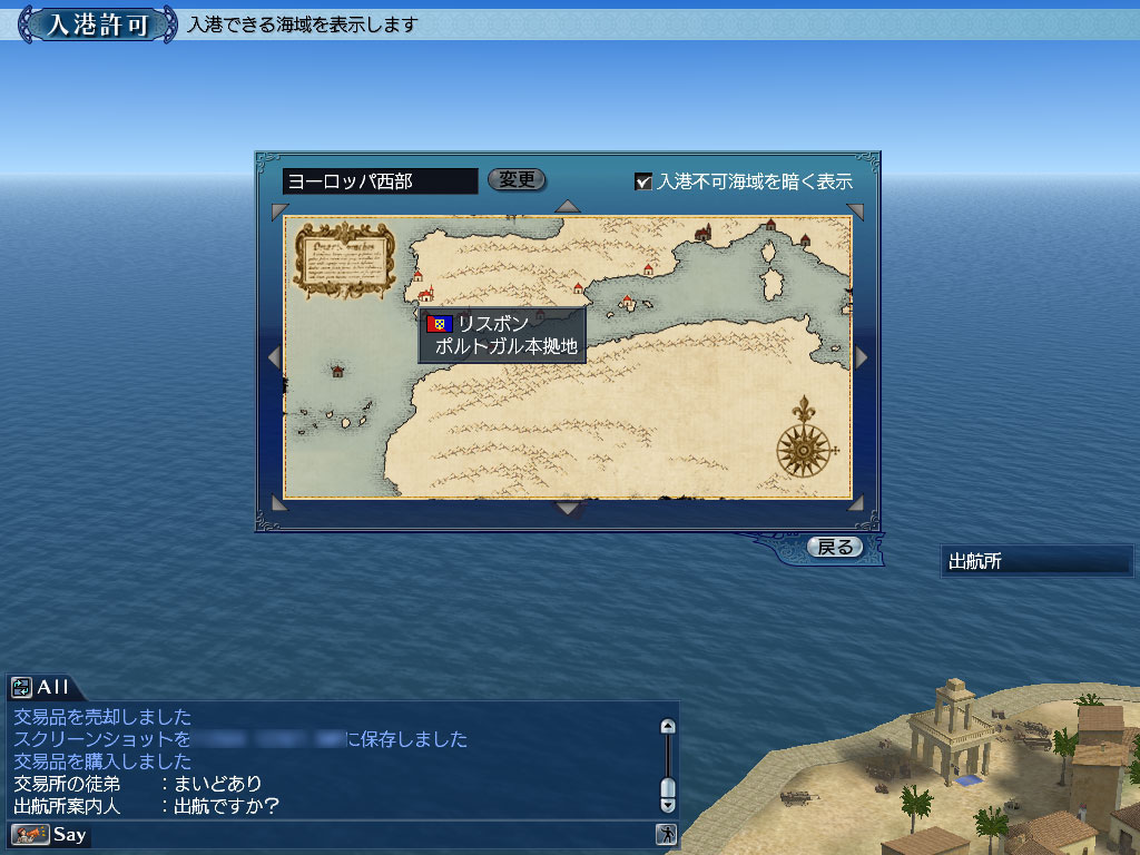 続いてファロの交易所で単価388Dの鶏肉5個を購入,セビリアの交易所で単価410Dで買い取りしてもらえたので,110Dの利益が得られた。ちなみに,セビリア〜ファロ間は,片道3日程度の航行距離がある。物資の補給で1往復当たり250D前後の費用で済むため,こんなお手軽な交易でも十分利益を出せるようだ。……正直,さほどおいしい交易とは言えないのだが。