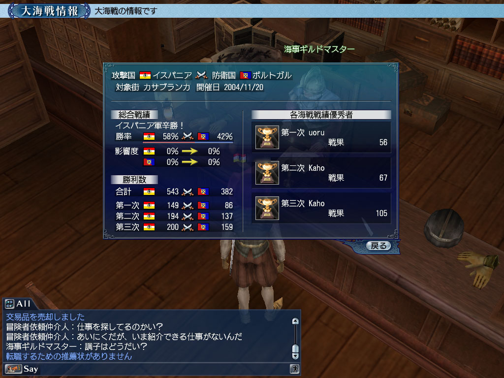 第一回大海戦イベントの結果は,ギルドマスターのところで確認できる。数字を見る限り,かなりの激戦が展開されたようだ。「無敵艦隊北上!」が楽しみである |
