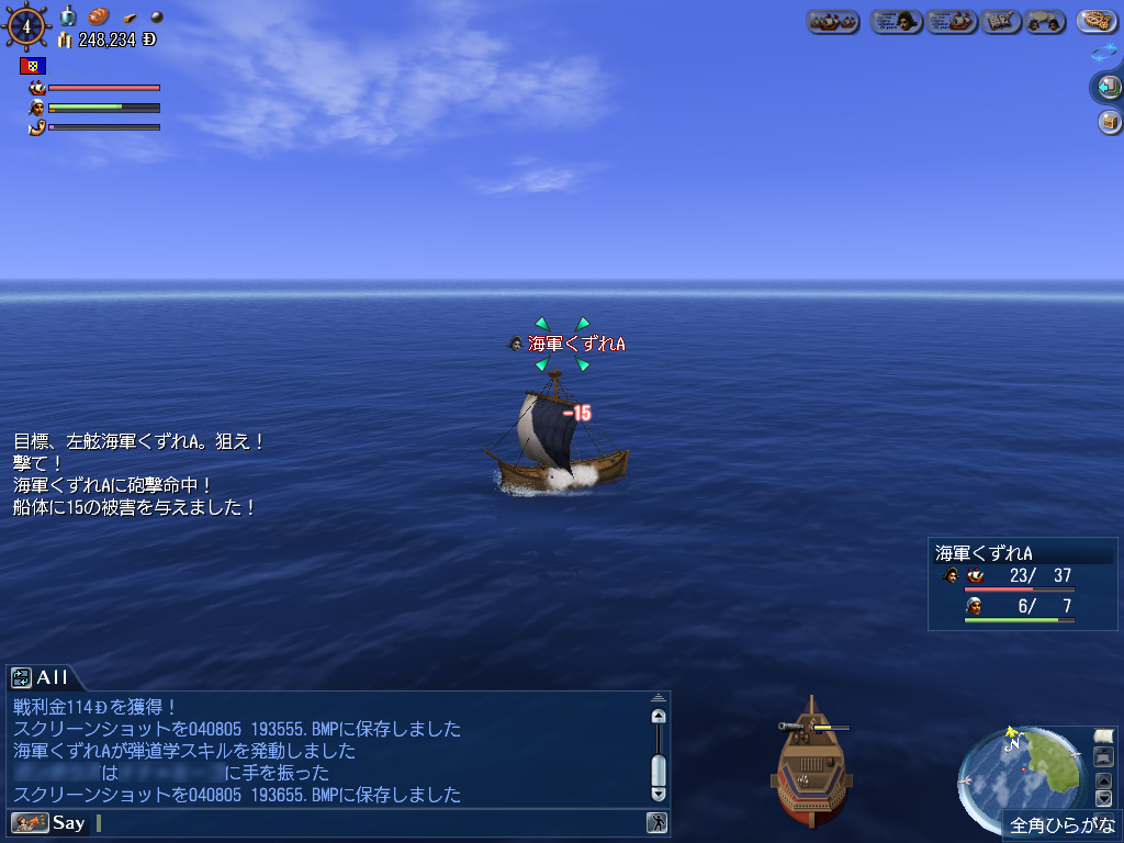 大砲ゲージが黄色から赤に変わったら砲撃可能というのは,海上戦闘の初歩の初歩である。しかし,ゲージが赤になってから6秒ほど待っていると,大砲ゲージが明滅し始め,一時的に攻撃力がアップするということはご存じだろうか? 明滅がかなり弱々しいため,タイミングを掴むまでは判別しづらいが,ゲージ明滅状態で砲撃操作を行えば,敵船に大ダメージを与えることが可能になる。筆者の場合,普段は一桁ダメージがほとんどなのだが,このタメ砲撃(?)で二桁ダメージをポンポン出せるようになった。砲撃の間隔が開くため被弾回数も増えるが,一対一の砲撃戦ならば攻撃力アップのメリットのほうがはるかに大きい。ぜひ積極的に狙ってみよう。