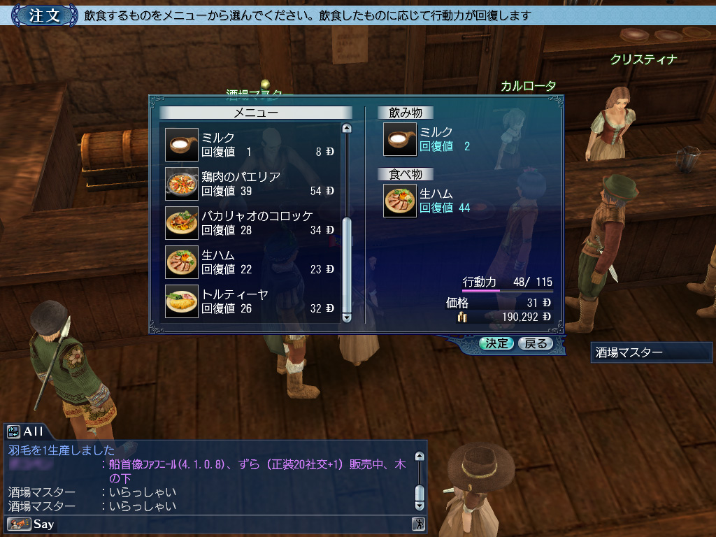 そんなわけで食品商としての人生を歩み始めた(会計士のときからプチ食品商だったわけだが)筆者。優遇スキルの食料品取引と調理をフル活用し,急成長中である。そんな中,ちょっと便利な技を発見したのでお伝えしよう。酒場でミルクと一番安い食事を組み合わせて注文していれば,酔ったり満腹になったりすることなく,行動力をフルにしない限りは,連続注文で行動力をガンガン回復できる。特に生産系の活動に精を出している人にとっては非常に役に立つ技なので,「いまさらそんな……」などと言わないでもらいたいところだ。実際,前回お伝えしたカモメ情報と同様,筆者の周囲には知らない人も多かったし。