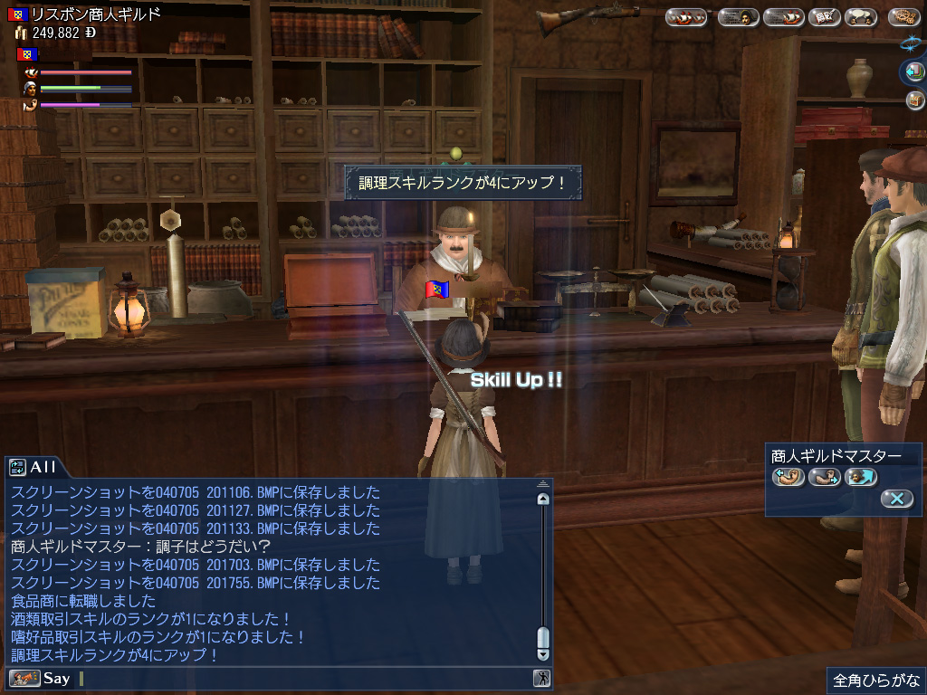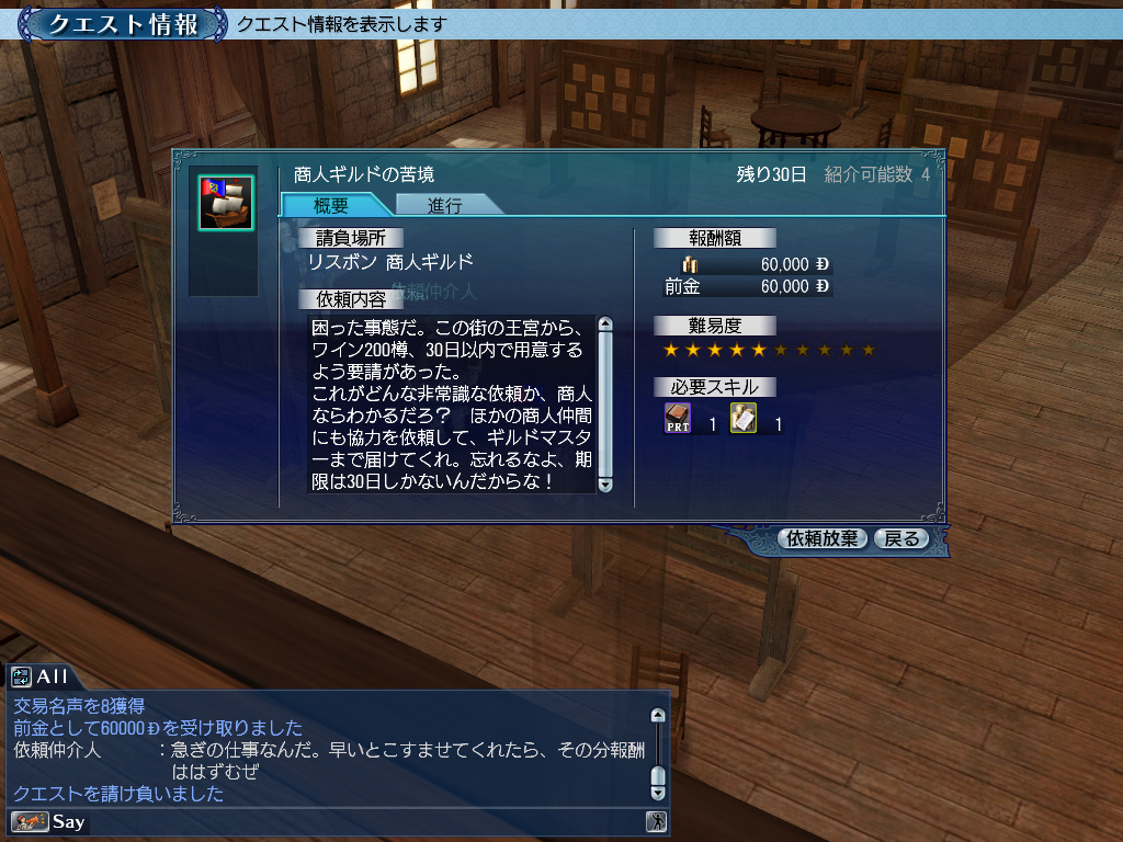 そんなわけで,すっぱりと会計士を辞め,調理・食料品取引に特化した食品商になるべく,転職クエストを受けてみた。筆者の場合は"商人ギルドの苦境"というクエストで,30日以内にワイン200樽を届けろ,という内容。クエストはリスボンで受けたので,ワインが購入できるオポルトまでは往復で5日前後。一度に購入・運搬できる量は限られているが,バザールをうまく利用して3往復でクリアできた。クエスト達成後,依頼仲介人に話しかけ,報酬や交易経験・名声とともに商人ギルド登録証をゲット,それを持った状態で商人ギルドマスターに話しかけることで,転職が可能になった。