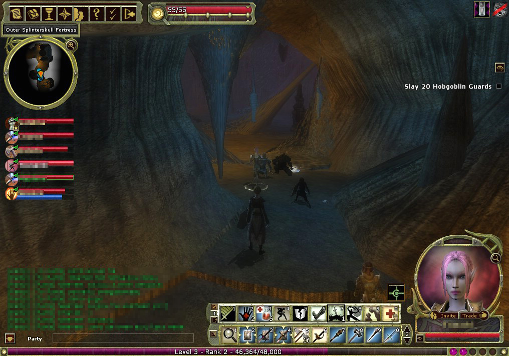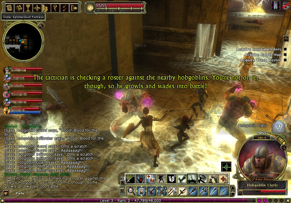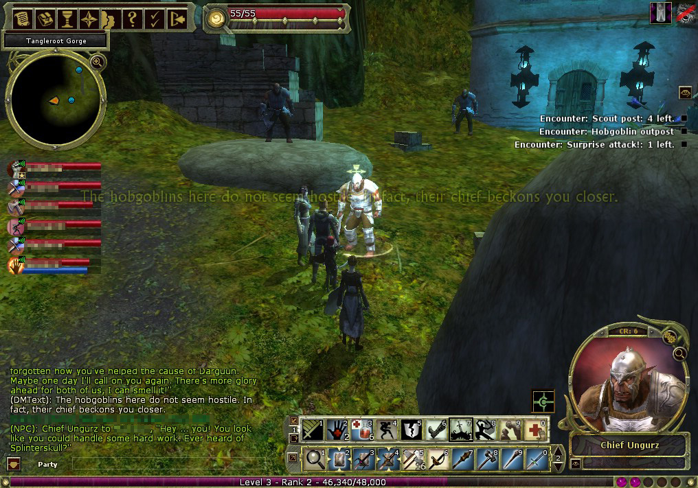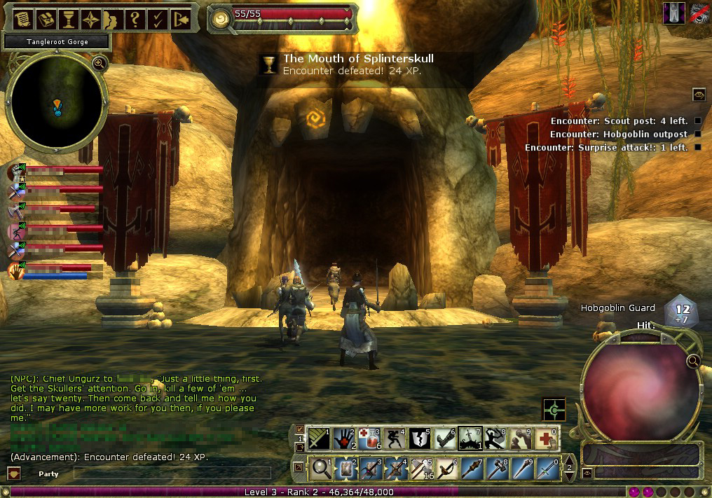 Ungurzに話しかけると,「Assault on Splinterskull」クエストが始まる。Chapter1からChapter7まで続く,非常に長いクエストだ。近くにSplinterskullという地下要塞があり,そこを根城にしているYarkuchというホブゴブリンが,悪事を働いているという。ホブゴブリン同士の抗争のような側面が多少あるものの,プレイヤーはUngurzを助けてYarkuchを討伐することになる。Yarkuchの勢力は強大なので,パーティは7回に分けて少しずつSpinterskull要塞の奥へと進んでいくというわけだ。