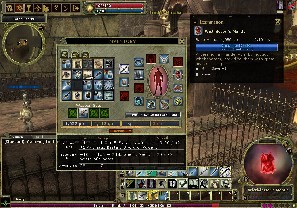「やはり無理だったかー」と,しょんぼりうなだれていたのだが,ふと「SPを増加させるアイテムを装備すればいいのではないか」ということに気づいた私は,Catacombsというクエストの固定報酬で「Witchdoctor's Mantle」というマントを入手。これを装備することで,とうとう呪文の発動が可能になった。ネックレスとマントはずっと身に着けていなければならないという条件付きながら,一生呪文の使えないパラディンにはならずに済んだのだ。めでたしめでたし。