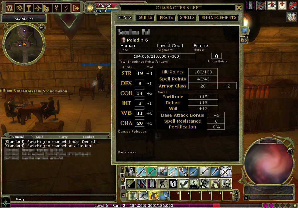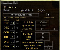 レベル4になった私は,1レベルのパラディン呪文の能力を得た。ただし,そのままでは呪文を唱えられないので,前回紹介した「Wisdom+1」のネックレスを装備してみる。すると呪文の発動自体は可能になったが,SP(スペルポイント)は0のままなので,やはり実際に唱えることはできなかった。