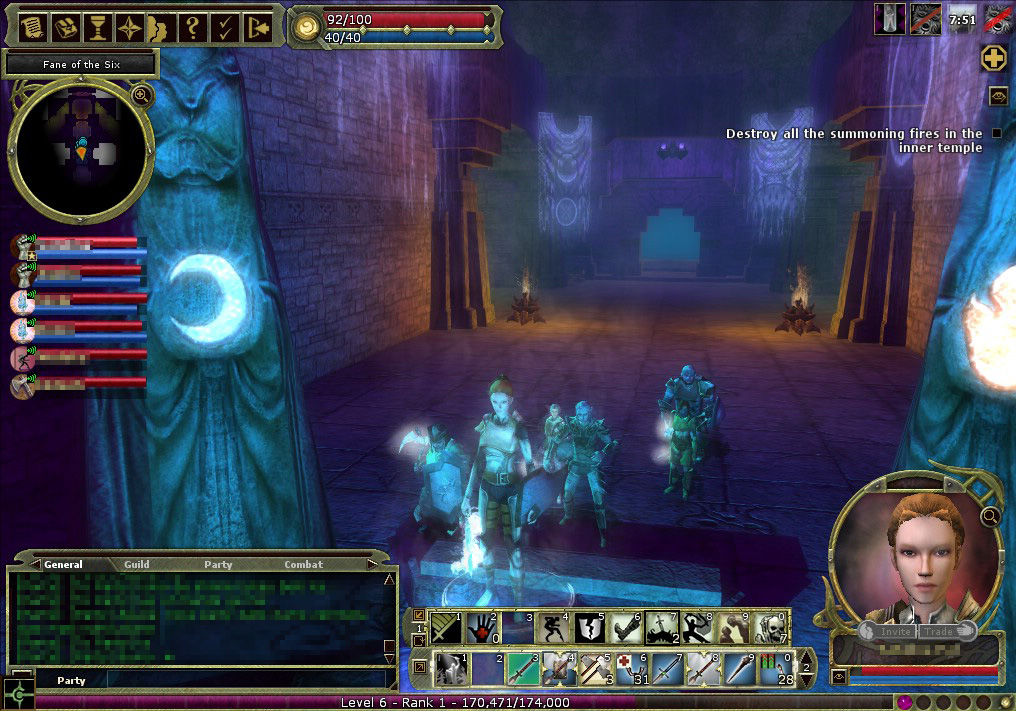 Grey Moon Waningはレベル6か7のクエストなのでまだ余裕があったが,問題は次のCult of the Sixである。こちらの対象レベルは8〜10で,範囲攻撃呪文である「Flame Strike」(この呪文は半分は火炎ダメージ,半分が無属性ダメージなので,火に対する防御を整えてもダメージを受けてしまう)を使ってくる敵が大勢いるのが恐ろしい。必然的に消耗戦を強いられることになるため,回復手段に余裕を持つことと,戦闘を長引かせないことが重要になってくる。