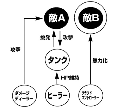 | 「タンク」は敵を挑発して引きつけ,「ヒーラー」はタンクのヘルスを守る。「ダメージディーラー」は敵に襲われないように注意しつつ攻撃を加える。「クラウドコントローラー」は余分な敵を無力化することで戦いをコントロールする |