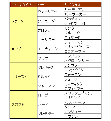 | EQ2ではまず序盤で「アーキタイプ」を選び,レベル10になるときに「クラス」を,レベル20になるときに「サブクラス」を選択する。「クラス」「サブクラス」へのランクアップはクエストを通して行われる。 |