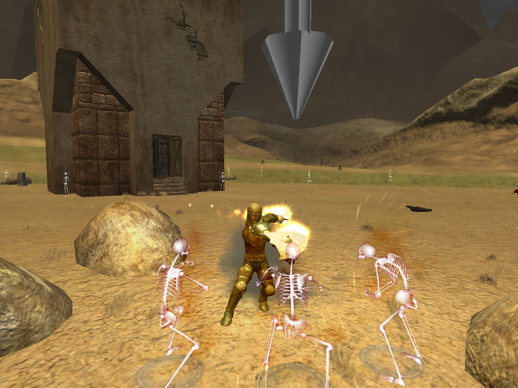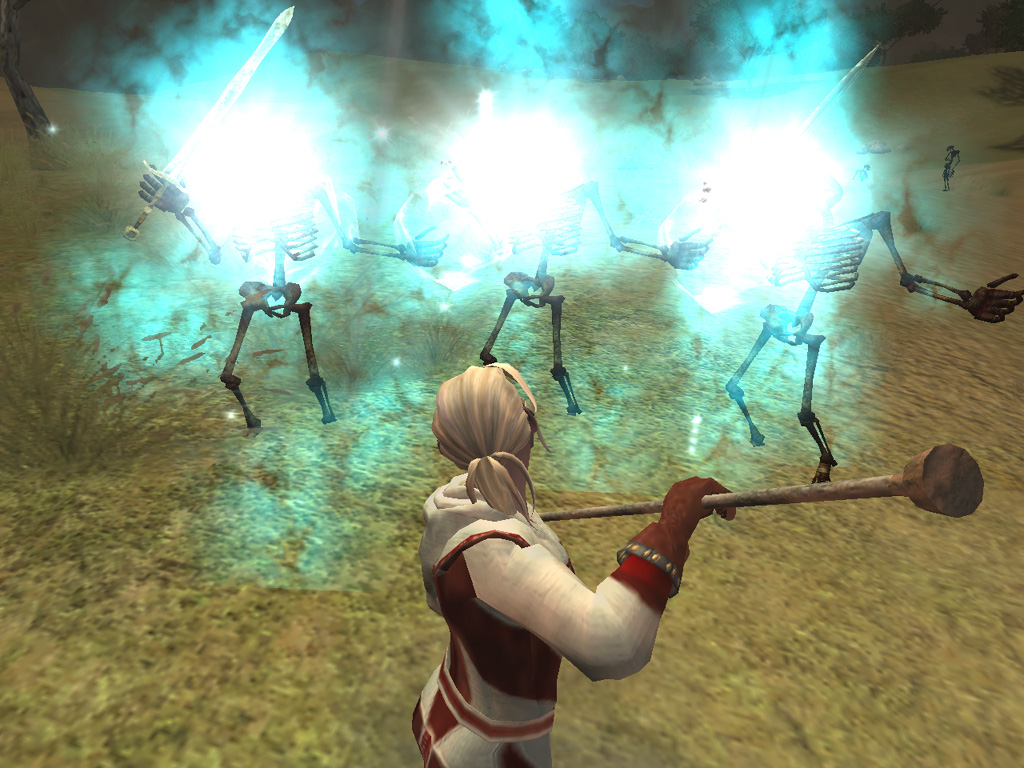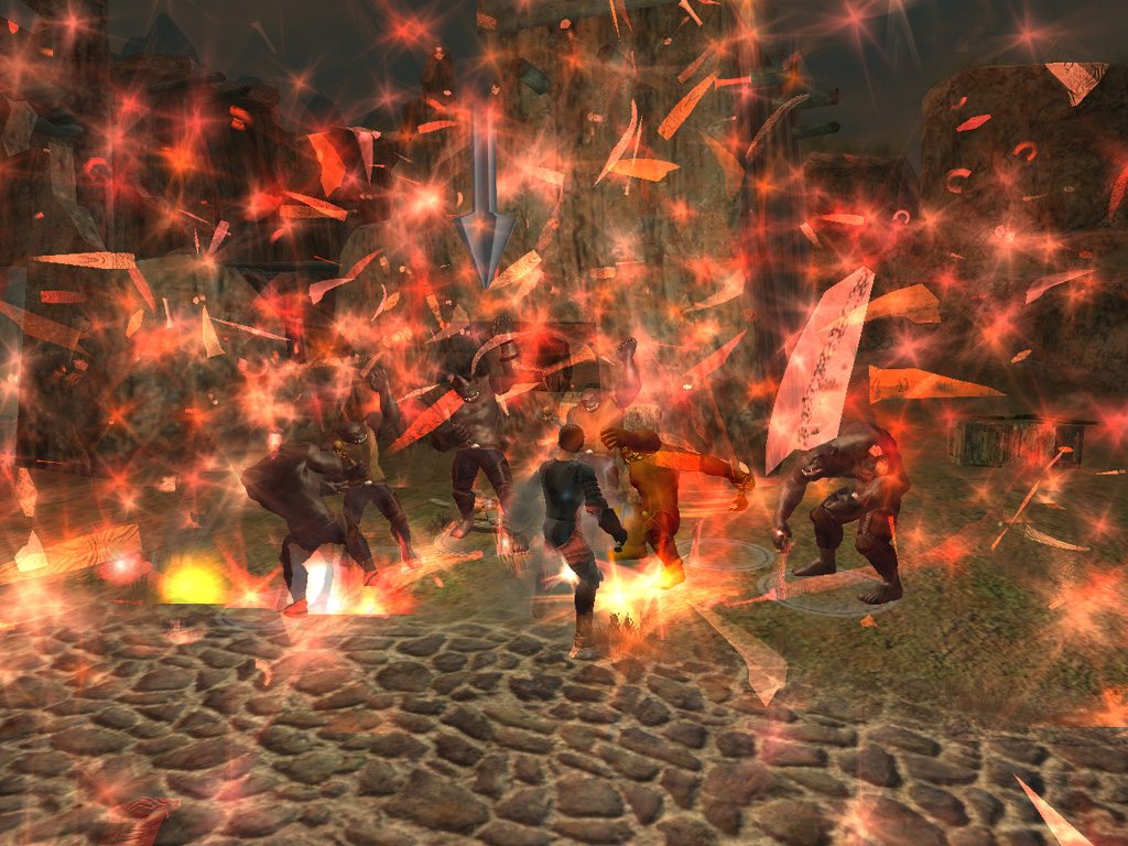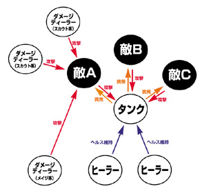 | EQ2での標準的な戦闘。タンクはリンクしている複数の敵の攻撃を自分に集め,ヒーラーはそのタンクのヘルスを維持する。その間にダメージディーラー達は1体ずつ集中攻撃で敵を倒していく |