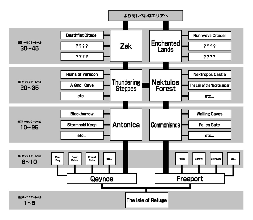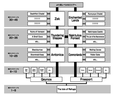 レベル20になるとケイノス側プレイヤーはサンダリングステップに,フリーポート側プレイヤーはネクチュロスフォレストに足を伸ばせるようになる。どちらも広いゾーンなので,レベル30程度まではこの近辺での活動が可能だ。そしてこれ以降の冒険も,レベル30台が適正なゾーン,40台が適正なゾーン,といった具合に続いていく。