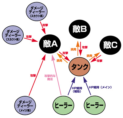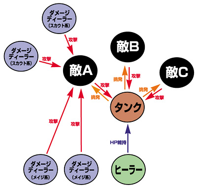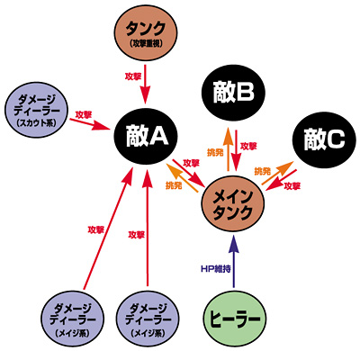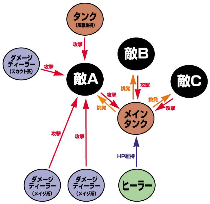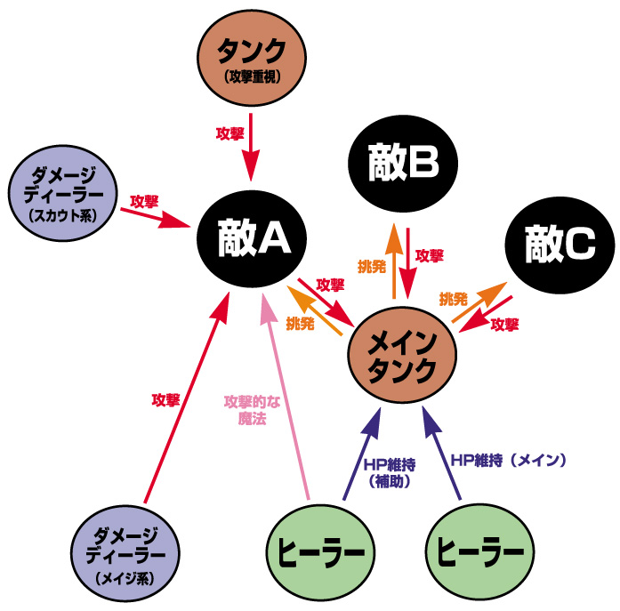 まずタンクが挑発を行ってエンカウンター全体の「ヘイト」を高め,敵の攻撃を一身に受ける。続いてヒーラーがタンクのHPを維持する。その隙に,ダメージディーラーは敵にダメージを与えて各個撃破していく。ヒーラーとダメージディーラーは,タンク以上に敵のヘイトを高めてしまわないよう,常に注意を怠らないようにする。