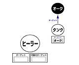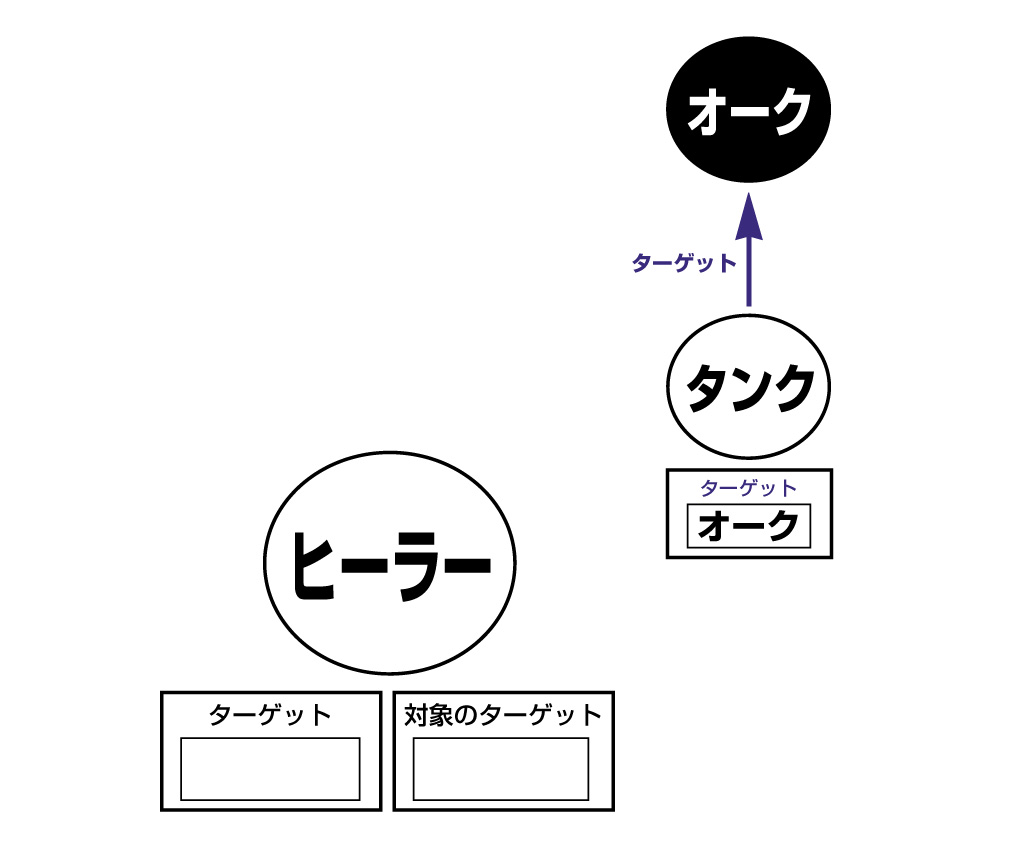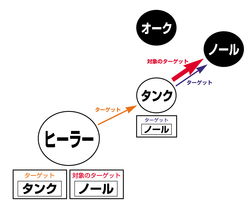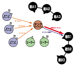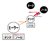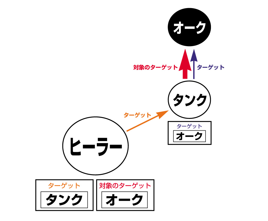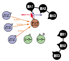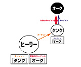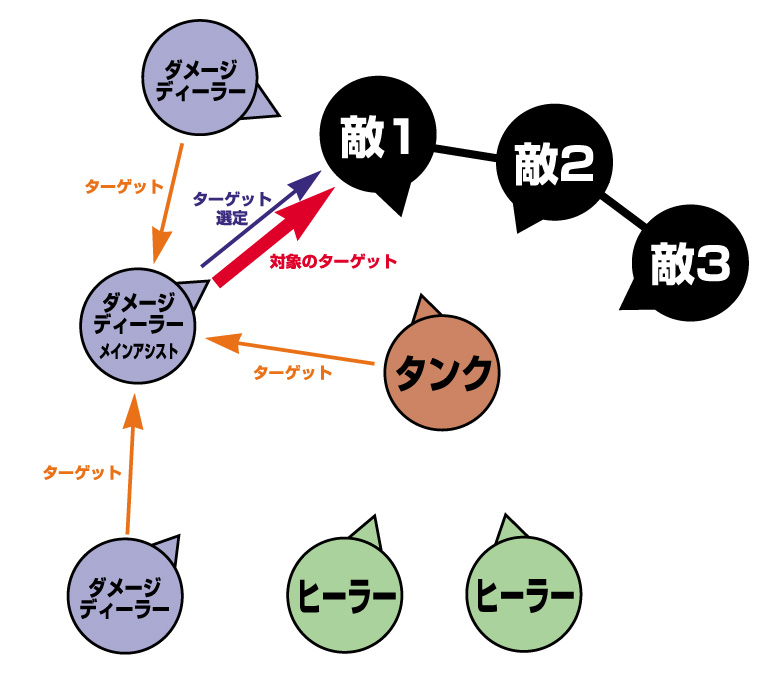 「こちら」の図を見てもらえば分かると思うが,タンクはメインアシスト役のダメージディーラーをターゲットしている。そのタンクを常にターゲットしているヒーラーは,このままでは攻撃魔法を使えないのである。