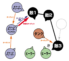 「メインタンクに対して"対象のターゲット"機能を使う」方法は,割とよく使われている。少々の敵であれば,この方法でも十分に捌ききれるので,カジュアルなグループプレイをするぶんには,メインタンクをずっとターゲットしたままでもそれほど問題は生まれないだろう。