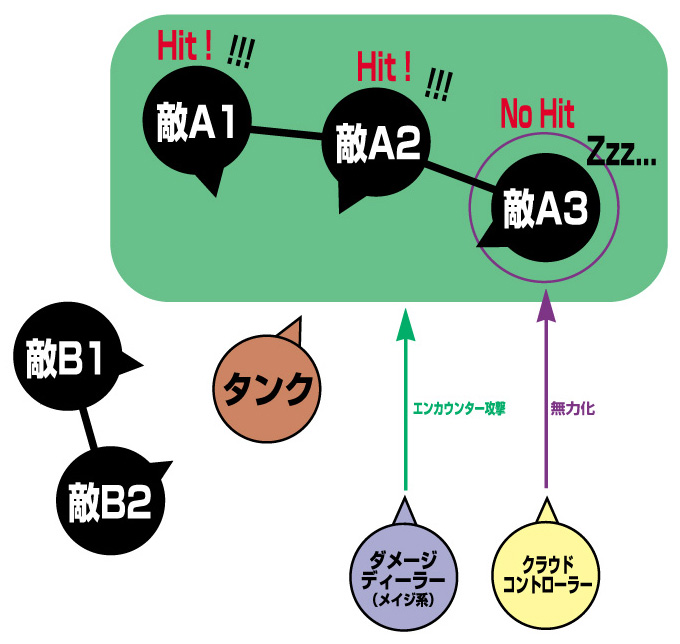 一方,アイコンの下地の色が青いスペル/アーツも,やはり複数の対象に効果が及ぶが,こちらは"エンカウンター"が対象となるのではなく,"術者の周囲"に無差別に効果が及ぶタイプ。そして,このタイプのアーツ/スペルのダメージは,すでに眠っているMobにもしっかり入る。つまり,緑ではなく青いアイコンの複数対象攻撃は,メズブレイクをしてしまうのである。メスメライズを戦術として使用しているときは,背景が青いスペル/アーツの使用は控えたほうがよいということだ。