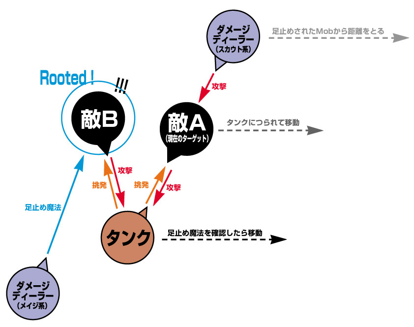 まず,メイジがメインターゲットではないMobに対して足止め魔法を使用する。タンクはそれを確認したら,足止めされたMobから少し離れる。すると,足止めされていないMobだけがタンクにつられて移動する。ダメージディーラー達は,それに併せて少し位置をずれる。その結果,足止めされたMobが離れた場所に置き去りにされる。手の届く範囲にPCがいなくなったMobは,その場に立ち尽くすしかなくなるというわけだ。