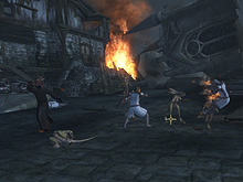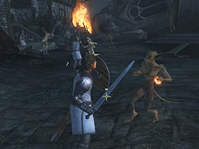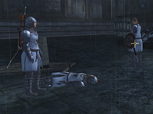 まぁ,ここってどうせスクリプト制御なんだろうから,ボーっと見ているだけでも平気だよねきっと……と高をくくっていたら,ちゃんとAIによって戦っているようで,中には死んじゃうNPCも出始めたので,慌てて戦闘に参加する。とはいってもこんなにゴタゴタした乱戦は初めてだし,どうにも要領良く立ち回れない。つい,味方に攻撃しちゃいそうなのだ。あ,やっちゃった,ごめんごめん。そんなことをしている間にも,次々と敵,ときどき仲間が倒れていく。実に展開が早い。