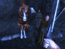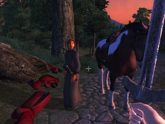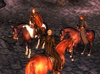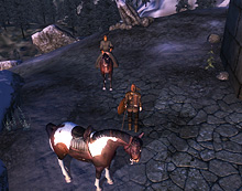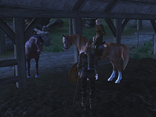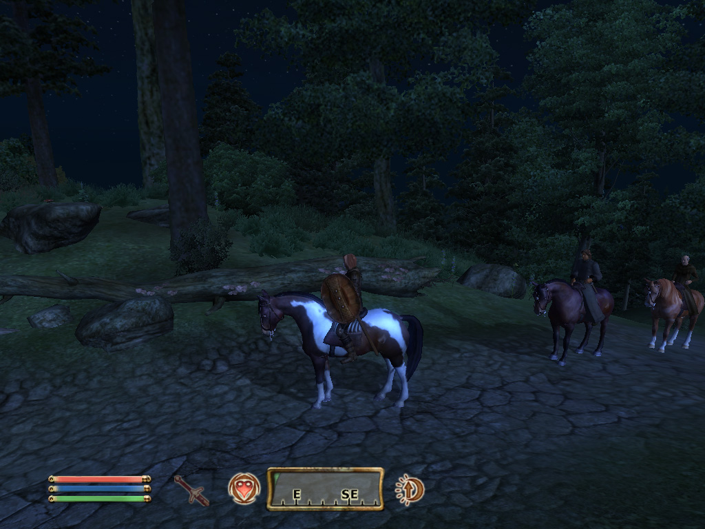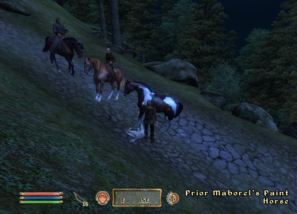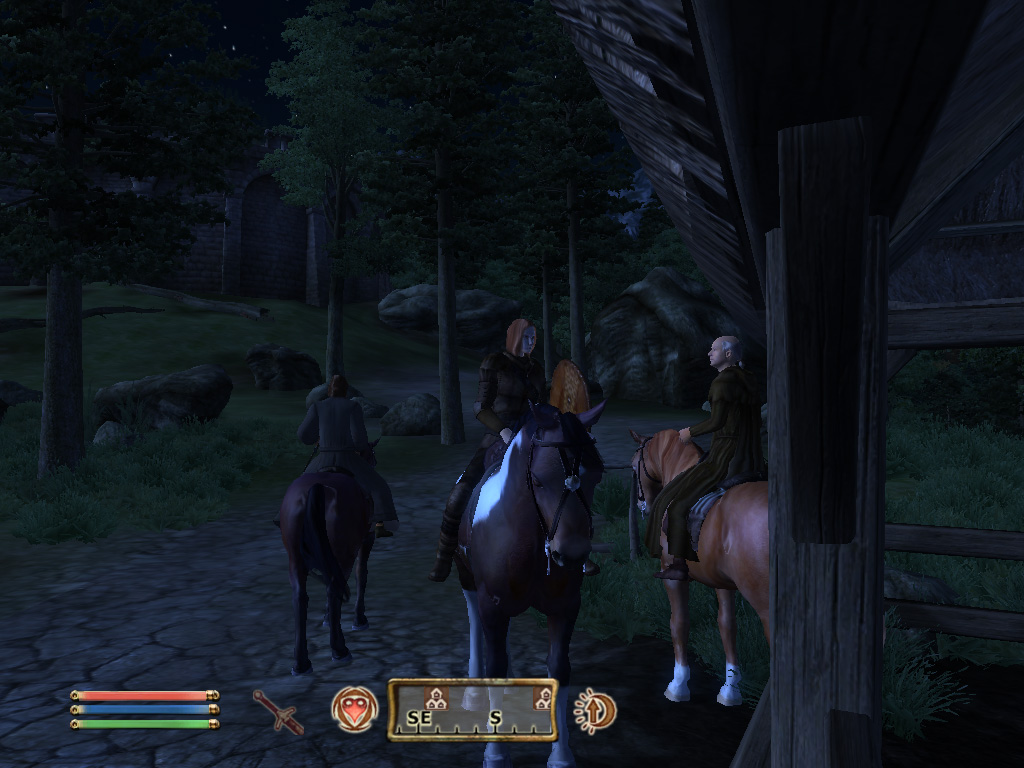 でも正直Kvatchを出てからこっち不眠不休なわけで,レベルアップ作業もまだしていないしちょっと寝たい。それに無理は美容にも良くないし。でももう二人は行く気まんまんらしく,馬にまたがってスタンバってこっちを眺めていて,ちょっと言い出しづらいです。ええと,じゃあ行きますよ。行けばいいんでしょ。