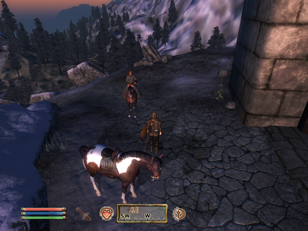 地図で見るとCloud Ruler Templeまではきちんと整備された道が続いているようで,旅は比較的安全である。馬に乗って道を巡回しているガードもいるようで,さらに安心。ただときどき野生のオオカミが襲ってくるので,その場合は馬から下りて対応する必要がある。そして何匹目かのオオカミと遭遇して,処理しようと鞍から降りて剣を振るったとき,事件は起こった。