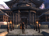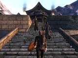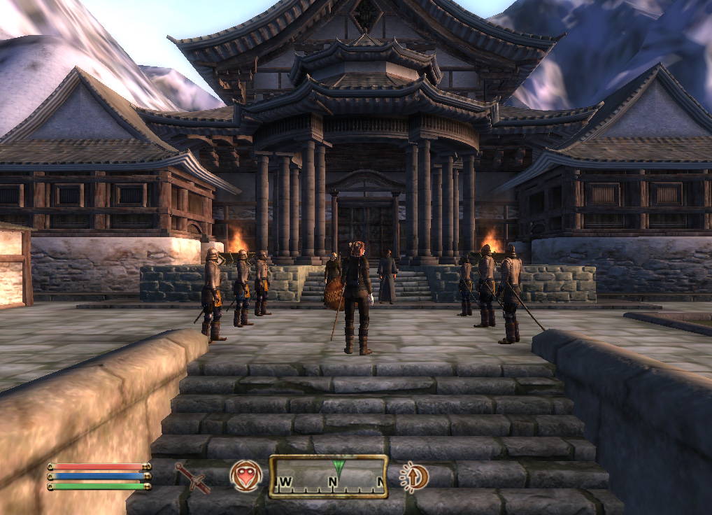 Cloud Ruler Templeに入る。重そうな扉をくぐり,階段を上がると,テンプルの前庭に出た。寺院の建物自体は見るからに東洋風の寺だった。前にはThe Bladeのメンバー達が整列している。見れば持っている刀はみんな日本刀っぽいし,鎧や兜もなんだかそれ風だ。