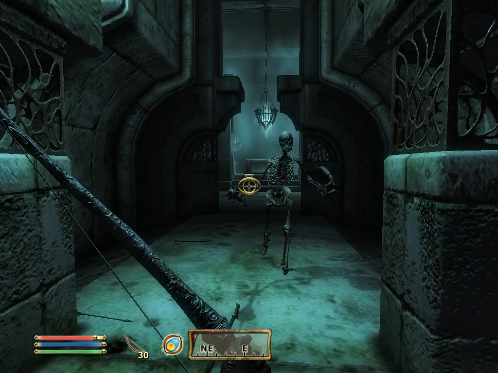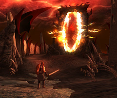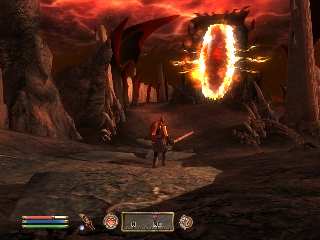 はるか昔。確か連載第3回くらいにも出てきたこのゲート。くぐると,オブリビオンという場所だ。本作のサブタイトルにもなっているオブリビオン(Oblivion)とは,この世界における“異界”というか“魔界”というか“地獄”というか,そのようなものだ。そこに通じるゲートが世界各地に開いて,こちらの世界に魔物がやってきてしまって大変だ! というのが,一応本作のバックグラウンドにはある。