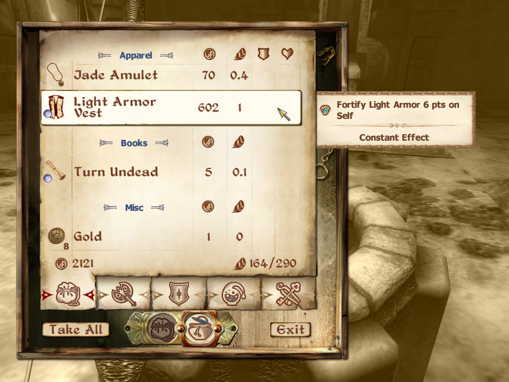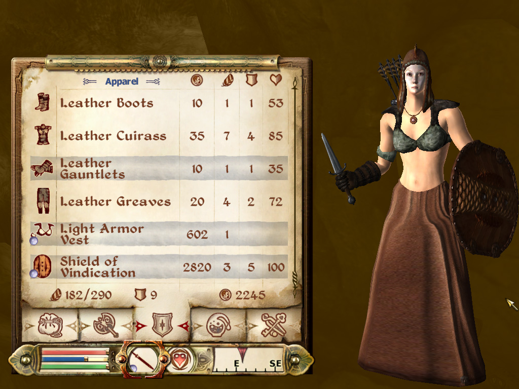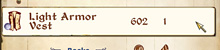 まず,Light Armor Vestという上半身装備。着るとライトアーマーのスキルが6ポイント上がるという服なのだが,この服自身はライトアーマーではないので,着用するとなると最も重要な胸部にアーマーをまとえなくなるという腹の立つ一品。なんだこりゃー!