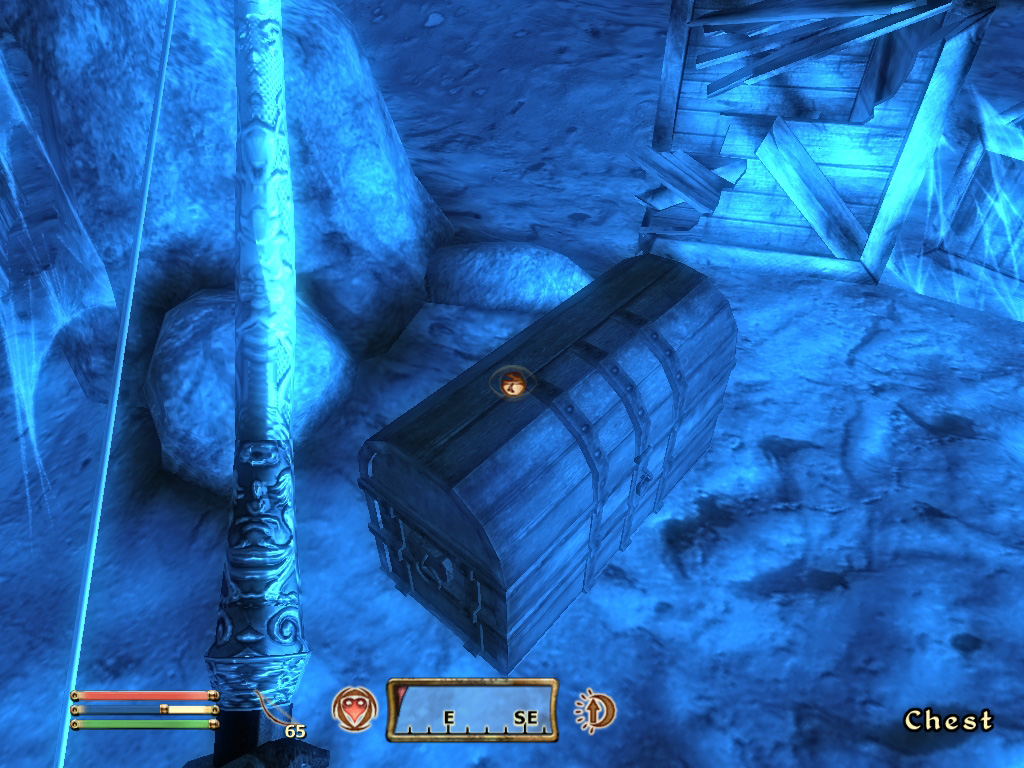 次はBase Ring of Nighteye。ある洞窟を探検中,へこんだ地形に水が溜まって池のようになっている場所を発見。その池の底をよーく見てみると,宝箱が沈んでいるのを見つけた。うっかり見過ごしてしまいそうな分かりにくい場所だ。これは良いのもが期待できそうだと,「ひょっとしてカワイイのゲット〜? \(*^。^*) / バンザーイ」とウキウキと箱を開けて出てきたのがこのリングだ。指にはめると,Nighteyeという暗闇が見通せるようになる魔法が常にかかった状態になる,割と強力なアイテム。ミッシェルはこれまで,隠密行動の妨げになりそうだという理由で,松明や明かりの魔法を使用してこなかった。しかしNighteyeであれば,目に魔法がかかるだけで表に明かりは出ないので,スニークしながらでも気兼ねなく使えそうだ。