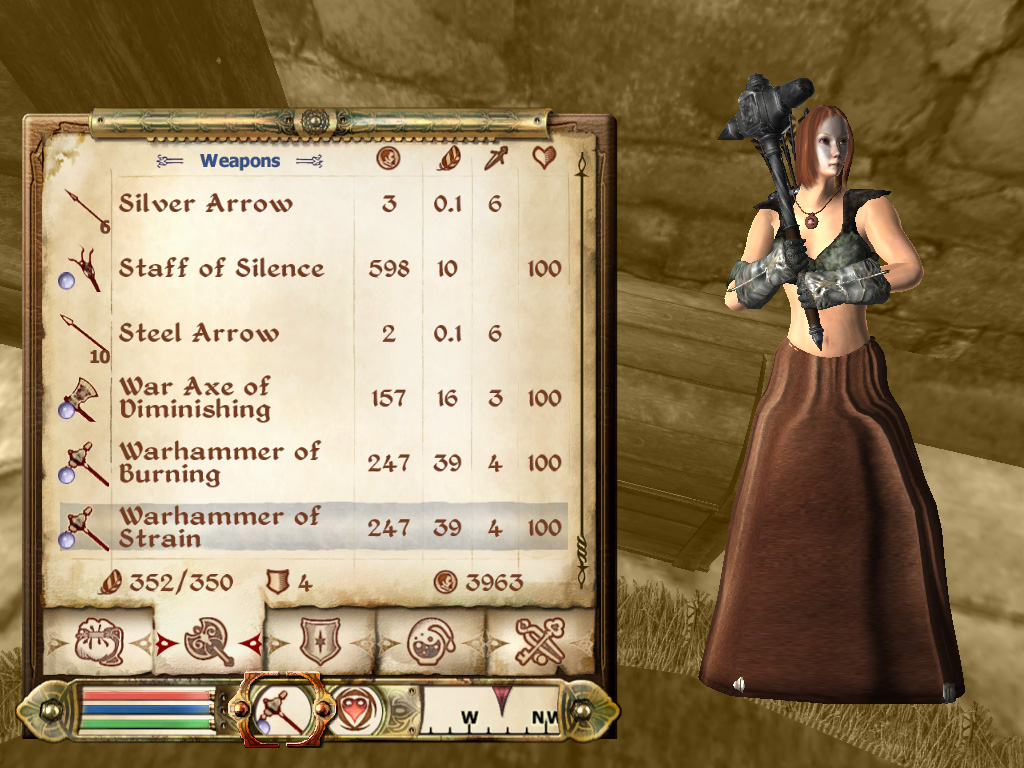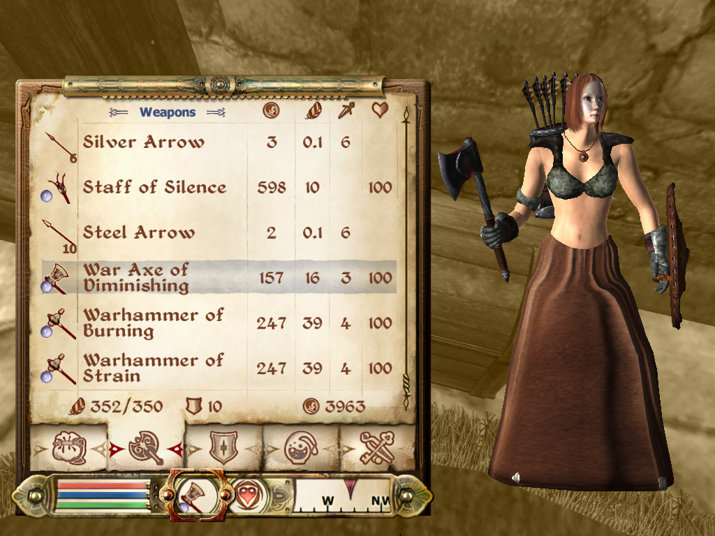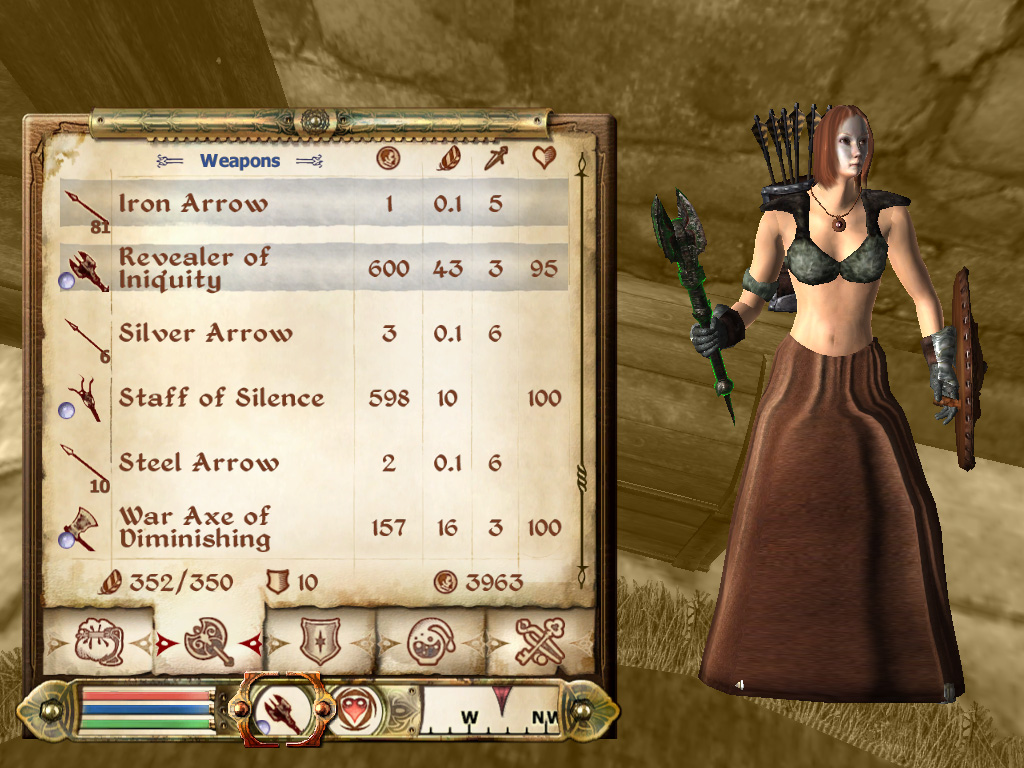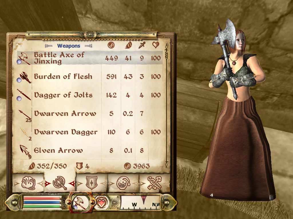 といった具合でBluntな武器ばっかり。ミッシェルは剣(Blade)が得意なので,剣が欲しいのです。一つ二つは出たのですが,それらは効果がイマイチで……。おかげで未だにメインの武器は,電撃の出る短剣 Dagger of Jolts。弓にいたっては,まだ魔法のかかった逸品なんか見たこともない有様。まあまだ電撃短剣+ノーマルの弓でもそこそこ戦えてるからいいけどさ。