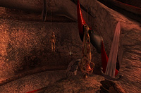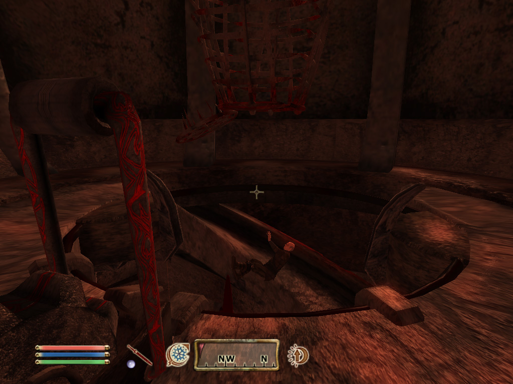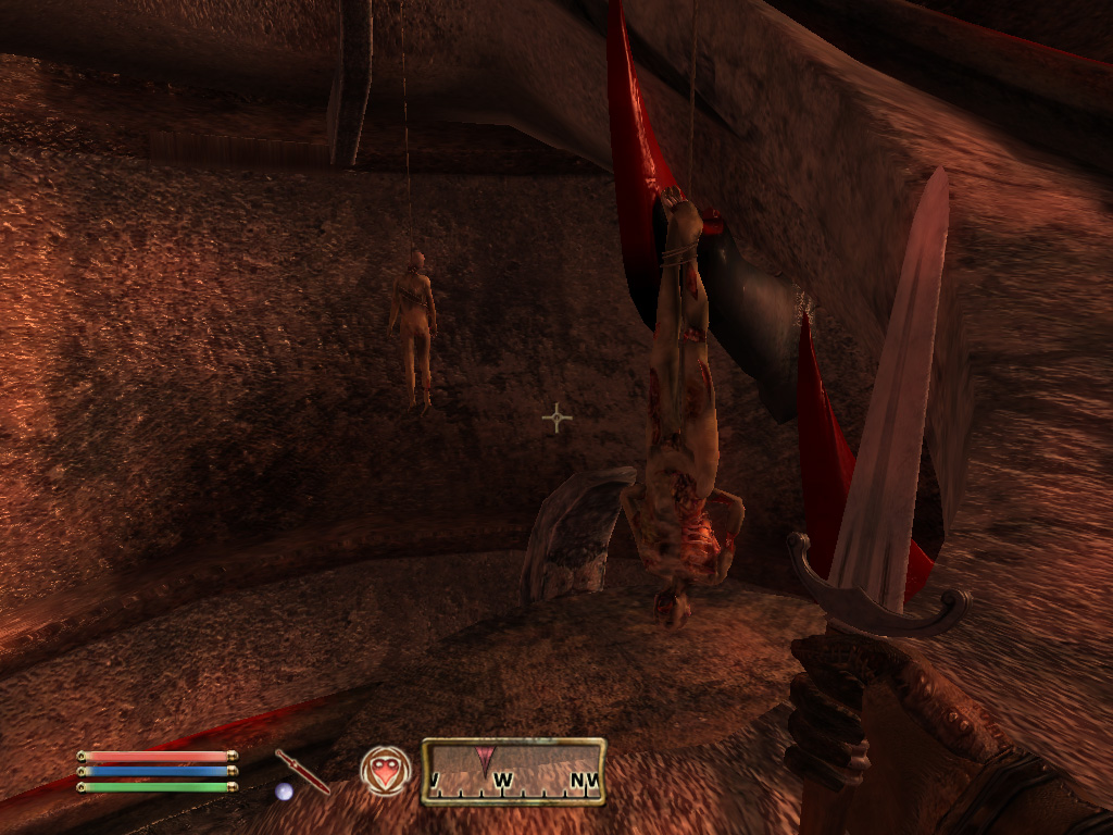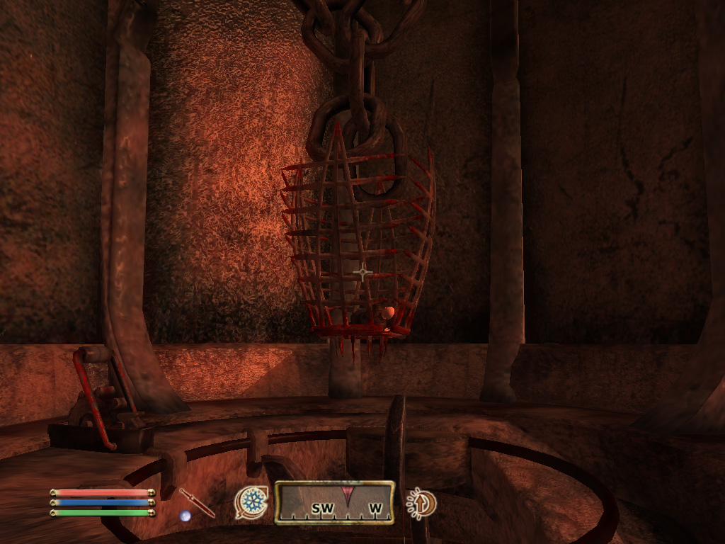とにかくアイテムを見逃すまいと,オブリビオンで,とある塔に入った。最上部まで上ってみると,どこかで見たようなオリが宙づりにされているのを発見。中にはぐったりしたオッサンが入っているのが見える。生きているのか死んでいるのかいまいち分からない。