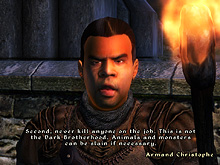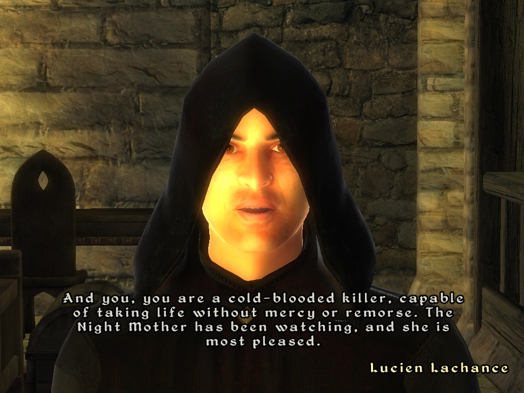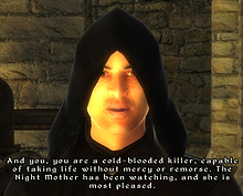 「私は暗殺者ギルド“Dark Brotherhood”のものだ。そしてお前は無慈悲に命を奪うことのできる冷酷な殺人者だ。我らがThe Night Motherはお前の行為を見て,お喜びになっているぞ……」