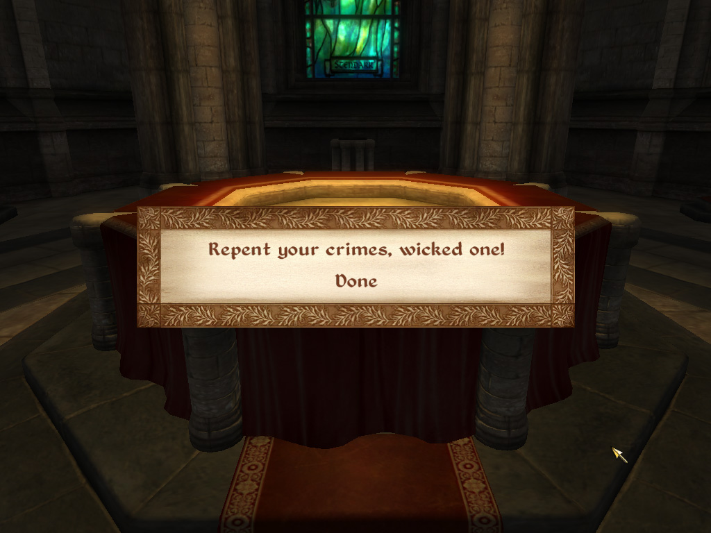 なるほど,レヤウィン(Leyawiin)の街にある教会に行って,祭壇でお祈りすればいいらしい。早速その教会に行き,祭壇を使おうとしたら……