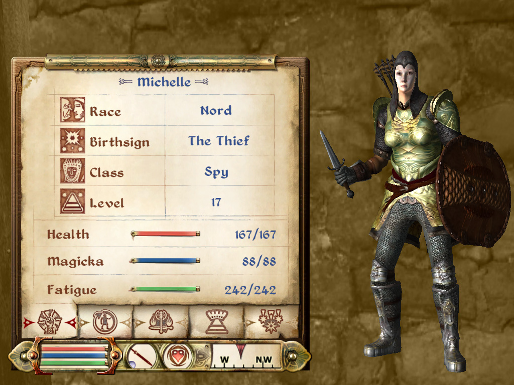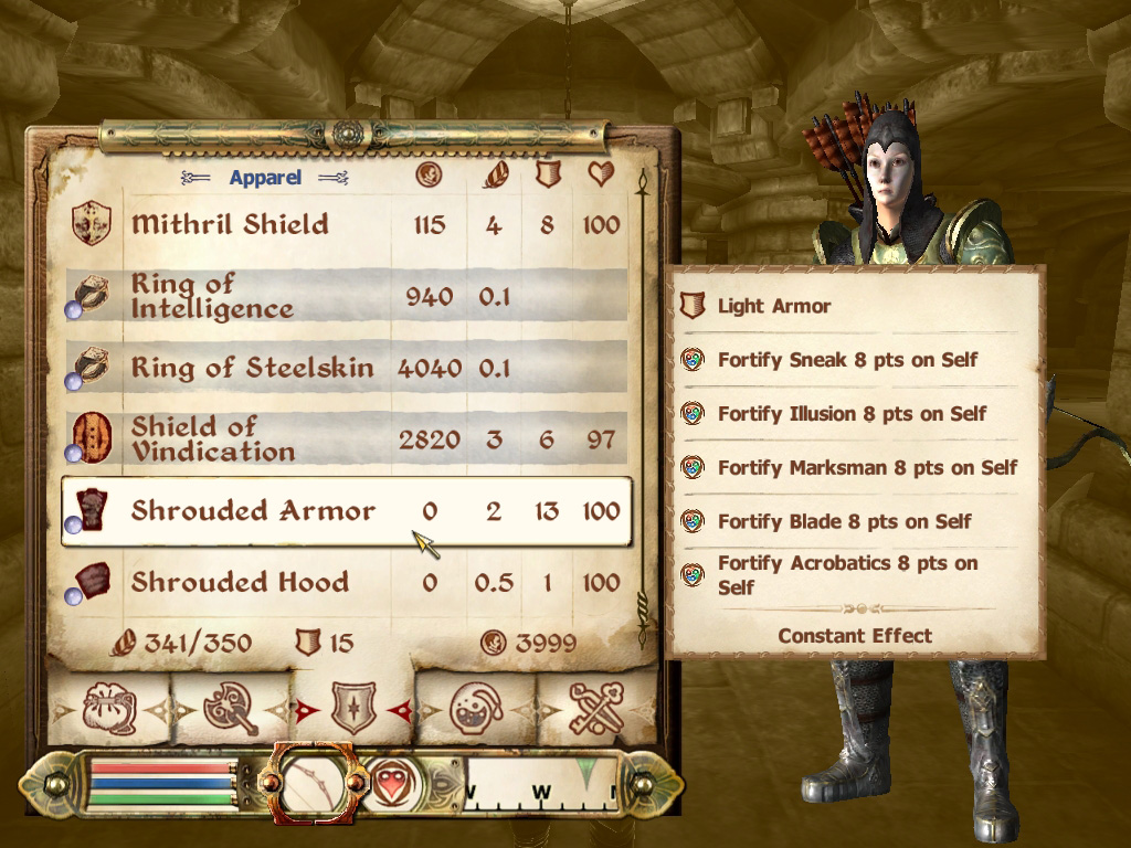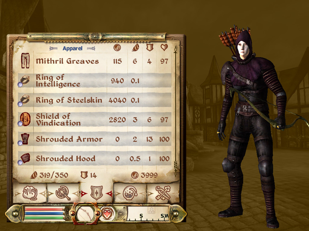 さて,病気は治った。さらに,いままで装備品はすべて拾った物でまかなってきたが,ある程度は買い揃えることにしよう。いま気になっているのは,頭部がいつまでも毛皮のヘルメットであることなので,チェインメイルの物を買ってみた。最近の戦利品と合わせて,いまミッシェルの外見はこんな風になっている。
