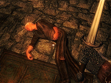 ちなみに本作では,こちらに対して敵対的なNPCを殺しても,それは正当防衛と見なされて,犯罪としての殺人にはカウントされない。だから暗殺者ギルドからのお誘いを受けたい場合は,敵対的ではないNPC = 一般市民を手にかける必要がある。……うーん,やっぱちょっと気が引ける。でももう殺るしかない。