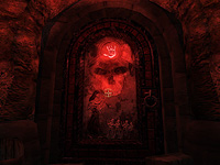 指定された廃屋の地下に行ってみると,すげぇやばい雰囲気の扉が。表面にはナウシカのオープニングっぽい絵が描いてある。