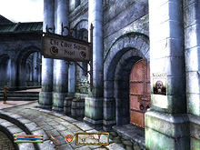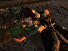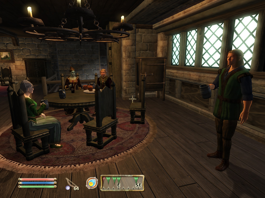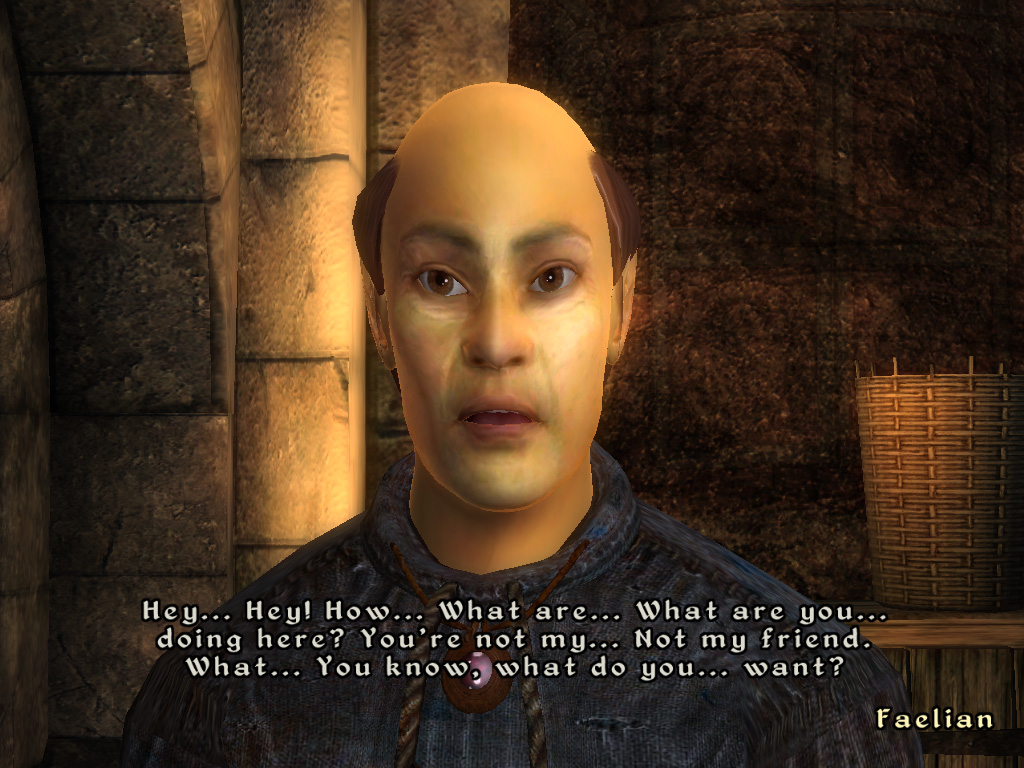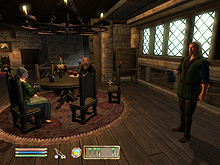 ターゲットがインペリアルシティにいるハイエルフであることと,その名前は分かっているのだけれど,シティのどこにいるのかが分からない。それを聞き込みによって探り出すところがこのクエストの特徴だわ。暗殺者仲間のアドバイスから始まって,商業街区のエルフ達,そして宿屋の主人と芋蔓式に聞き込みを続けていったら,最後にターゲットを見つけることができたの。でも……
