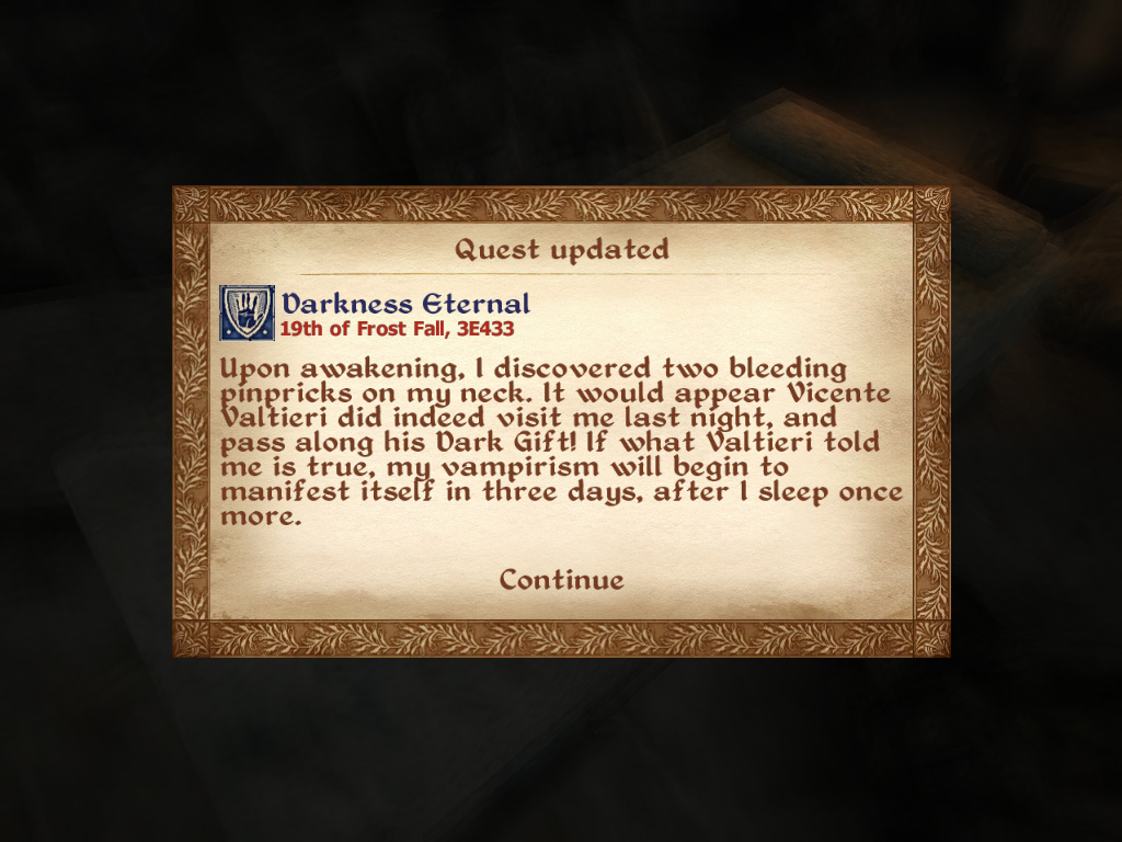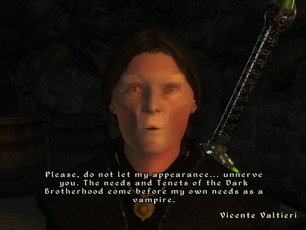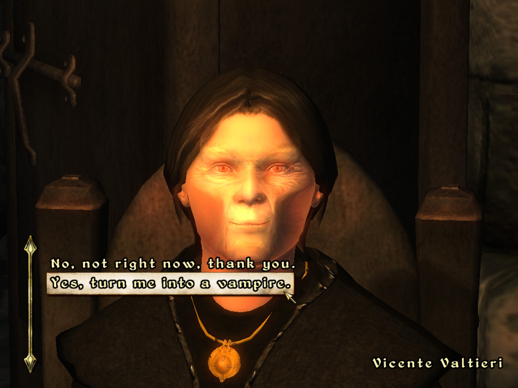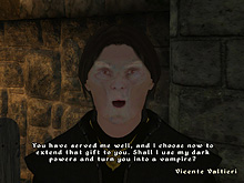 Oblivion(というか,The Elder Scrollsシリーズ)の世界には,バンパイア(Vampire)が存在する。バンパイアという種族がいるわけではなく,普通の人間がバンパイア症(Vampirism)にかかることで,バンパイアになってしまうのだ。