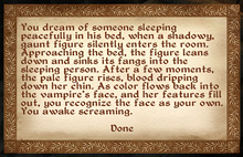 「あなたは夢を見た。誰かがベッドで安らかに寝息を立てている。そこにげっそりと痩せた人影が現れてベッドへと近づいていった。人影はかがみ込み,寝ている人物の首もとへと牙を突き立てた。しばらくして青白い顔を上げると,その口からアゴにかけて血が滴っている。吸血鬼の顔色が回復し,これまで見えなかった顔の特徴が見てとれた。あなたはその顔が,あなた自身のものであることに気がついた。あなたは叫びとともに目を覚ました」
