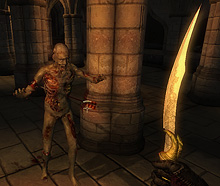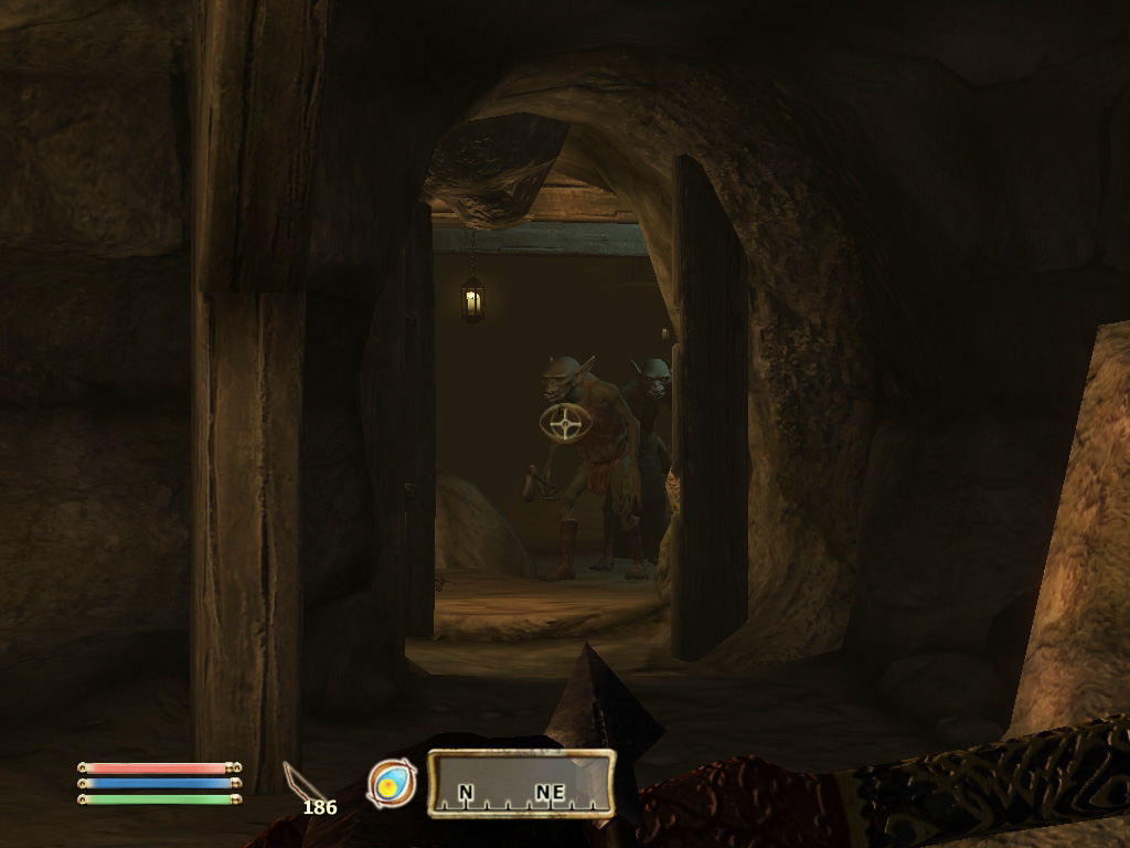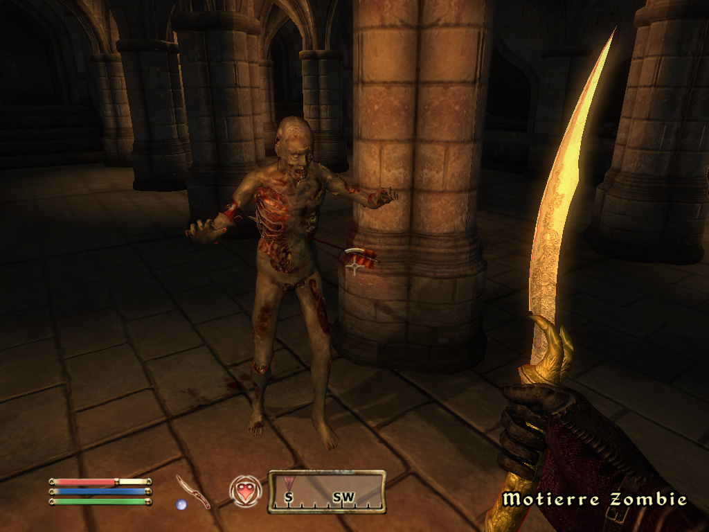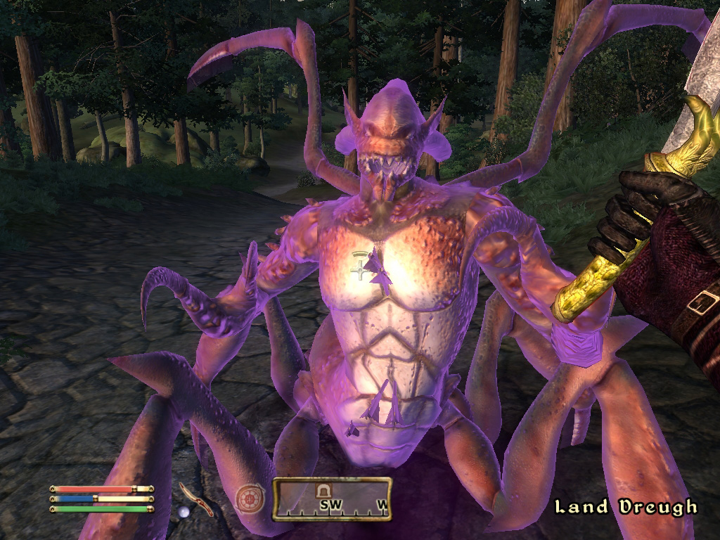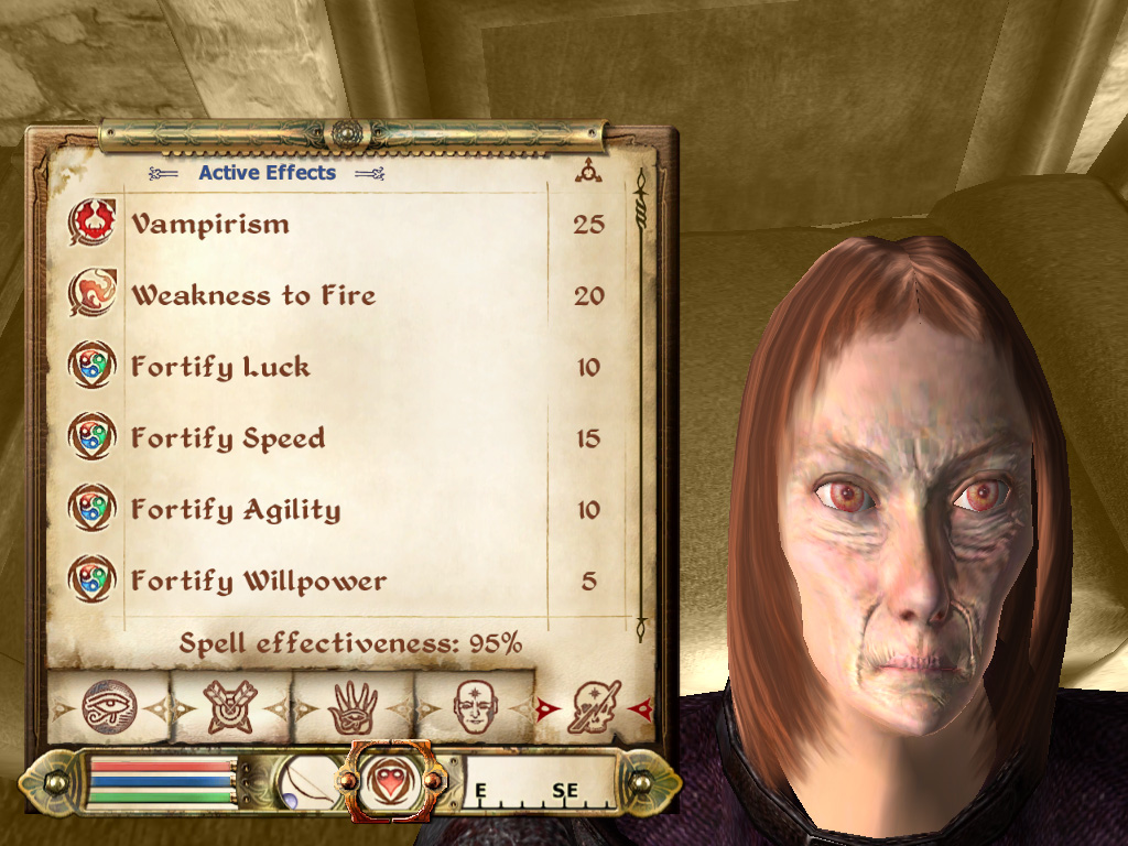 それではバンパイアになった感触をいろいろと試してみようと,街を歩いたり,ダンジョンに行って戦ったりなど,しばらくさまざまな活動をしてみた。そうこうするうちに,バンパイアに関することがいろいろと分かってきた。Oblivionのバンパイア症は,なかなか面白い仕組みを持っているのである。