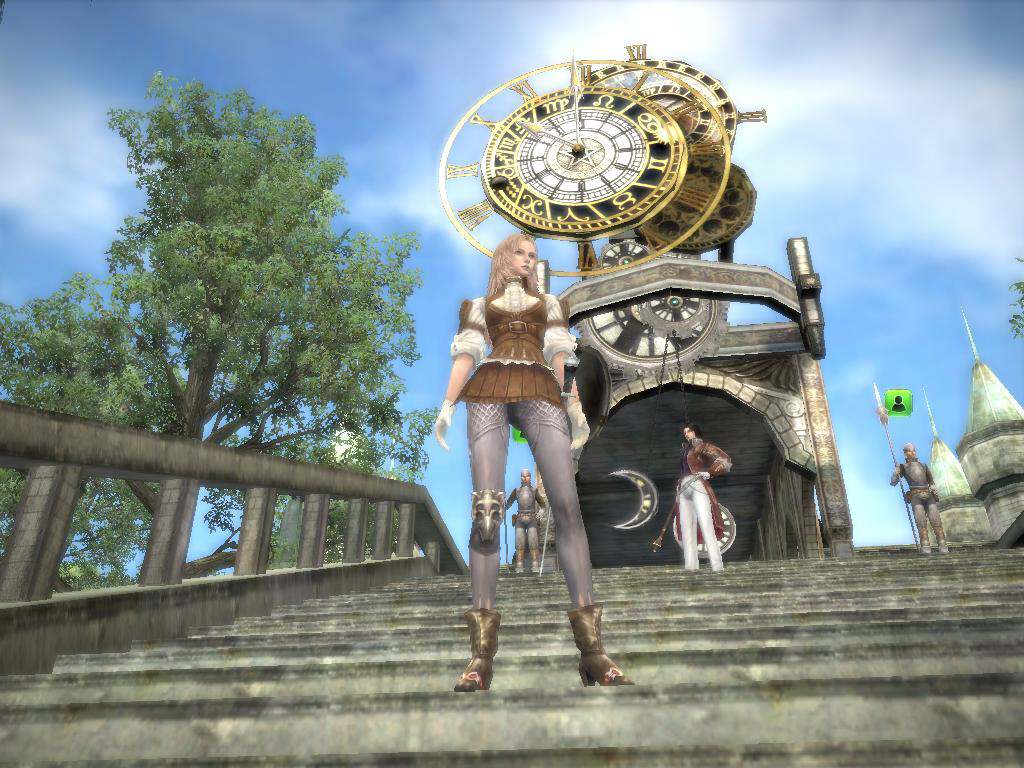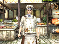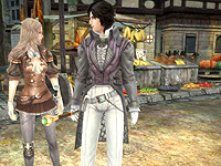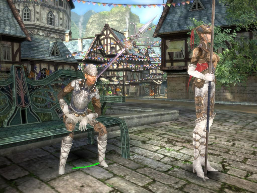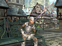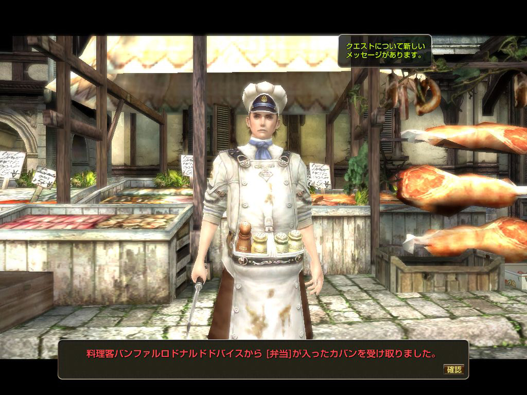 さて,弁当を受け取り,背中の美しいブルーニさんを左手に見ながら階段を上がる。パンファルロさんから見えないところでこっそり弁当を食べてから,武器屋前のベンチへ。しばし休息を取っていると,弁当の配達を待つリボルドウェ兵士の姿が目に入る(注:実際のクエストで届ける相手は,ここの兵士ではありません)。